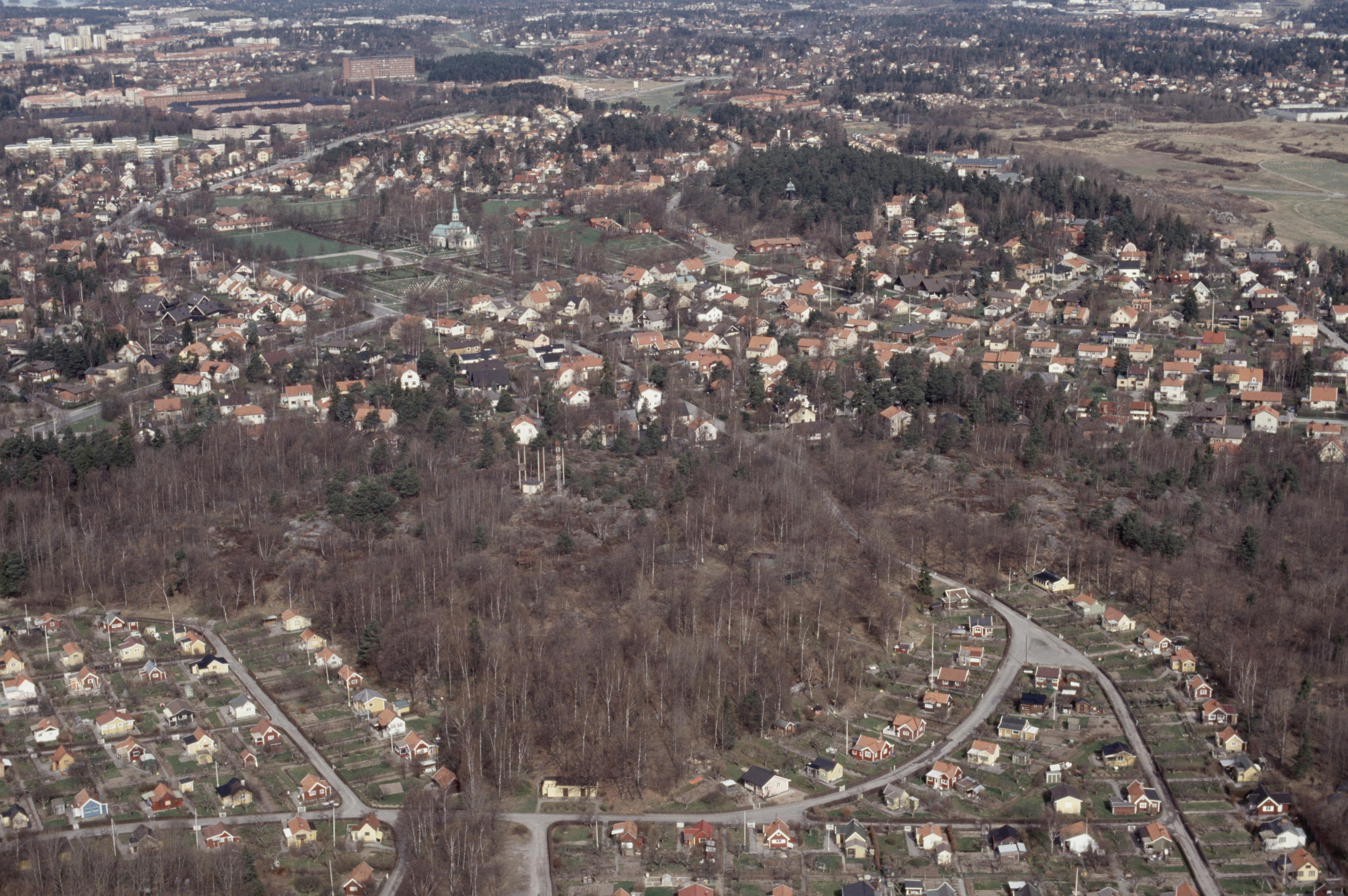 Beskrivning: Stadsdelen Bromma i Stockholms Västerort. Kortenslund i bildens nedre del. Till vänster över bildens mitt Bromma kyrka med medeltida kyrkotomt RAÄnr Stockholm 992. Bilden är tagen mot (väderstreck): NV