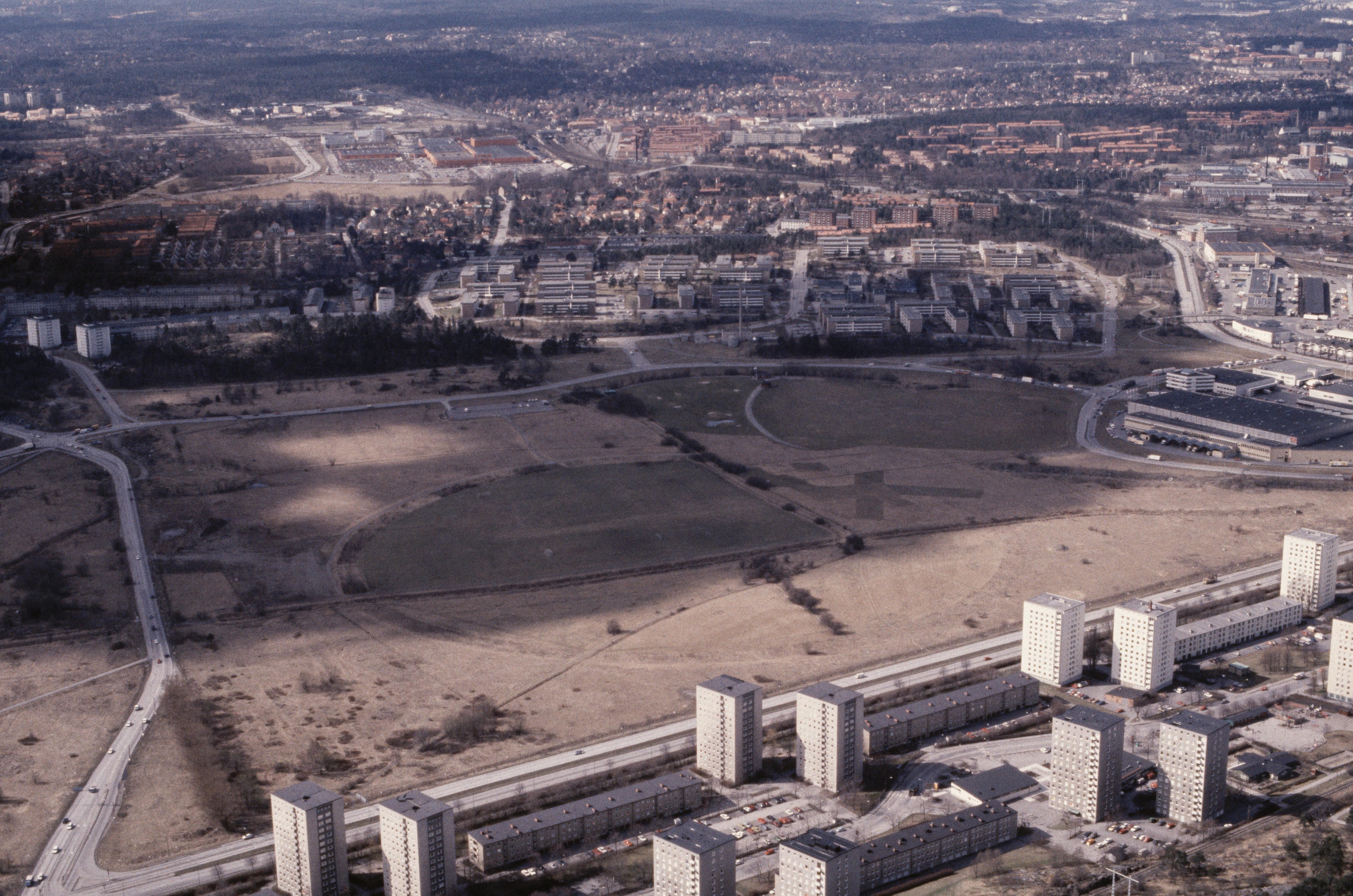 Beskrivning: Årsta. Vid bildens mitt Årstafältet med golfbana och Göta landsväg RAÄnr Brännkyrka 34:1. (NB! Tidigare var området i Brännkyrka socken). Bilden är tagen mot (väderstreck): SV