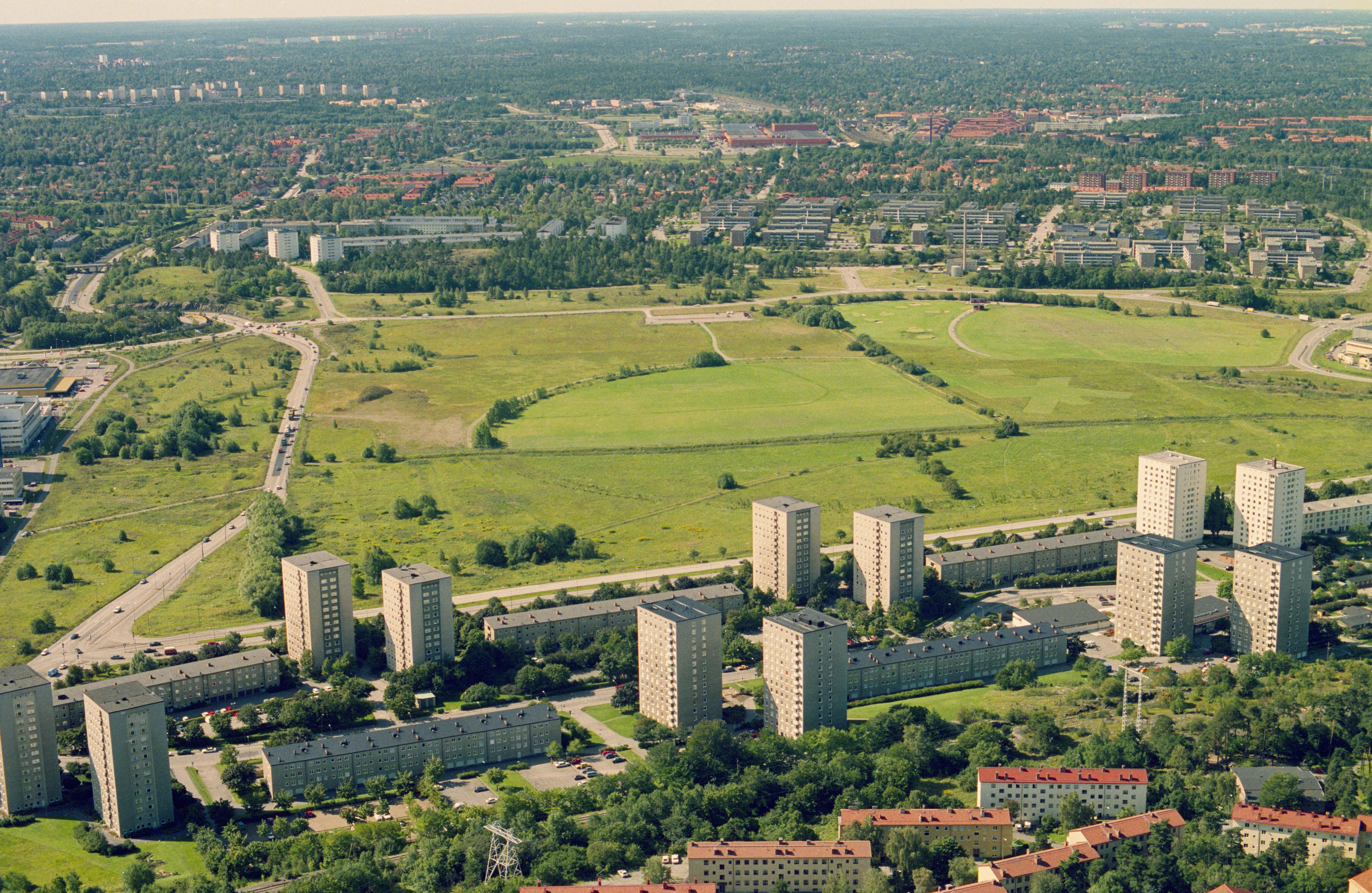 Beskrivning: Årsta. Vid bildens mitt Årstafältet med golfbana och Göta landsväg RAÄnr Brännkyrka 34:1. (NB! Tidigare var området i Brännkyrka socken). Bilden är tagen mot (väderstreck): SV