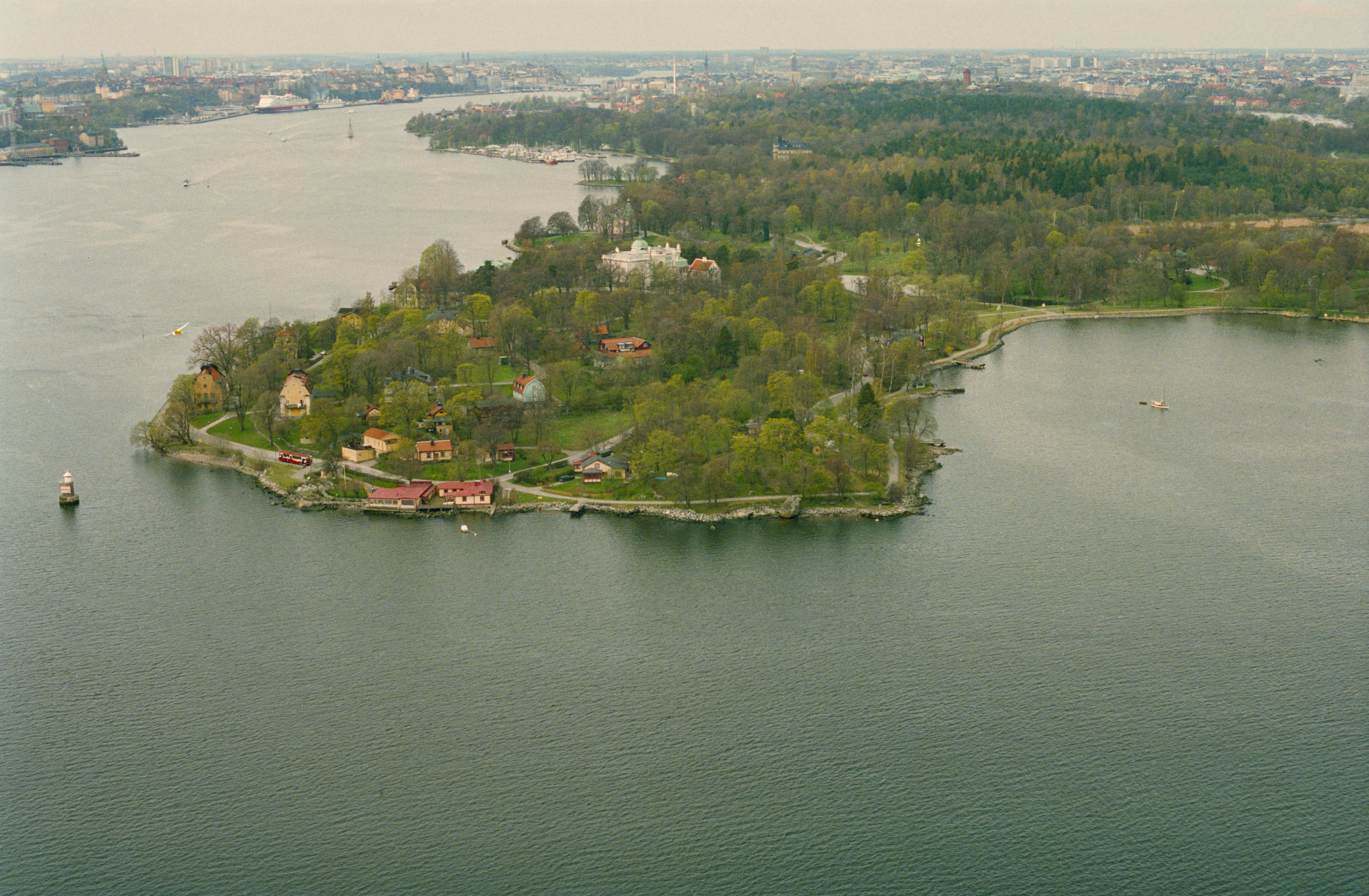 Beskrivning: Blockhusudden vid Saltsjön. Vid bildens mitt Thielska galleriet - statligt byggnadsminne RAÄnr Stockholm 87:1. I bildens övre del Stockholms innerstad. Bilden är tagen mot (väderstreck): V