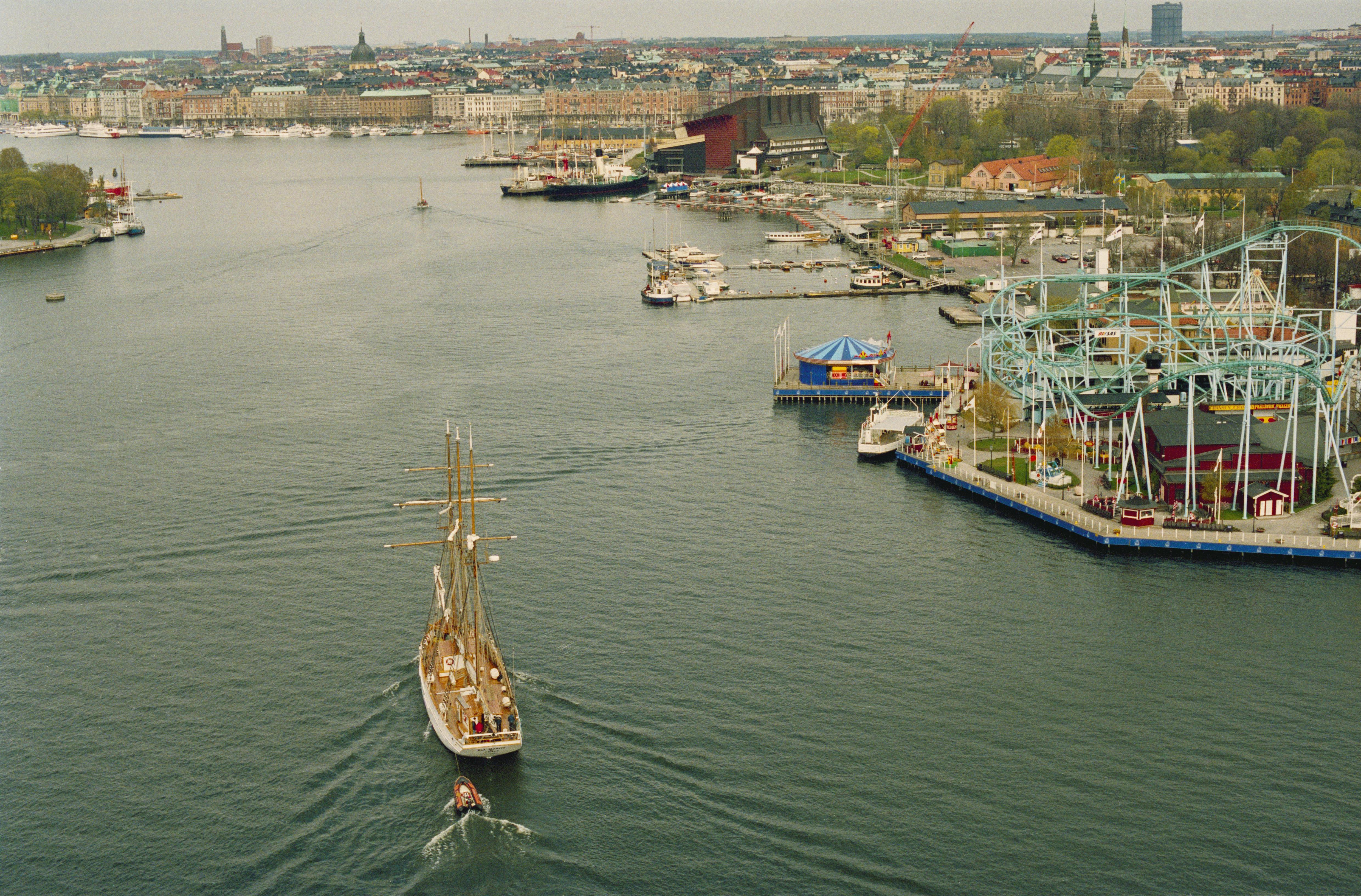Beskrivning: Båten / segelfartyget "Blå Marité" i Saltsjön vid nöjesfältet Gröna Lund. I bildens övre del Vasamuseet och Nordiska museet, Stockholms innerstad / Östermalm med Strandvägen m.m. Bilden är tagen mot (väderstreck): NNV