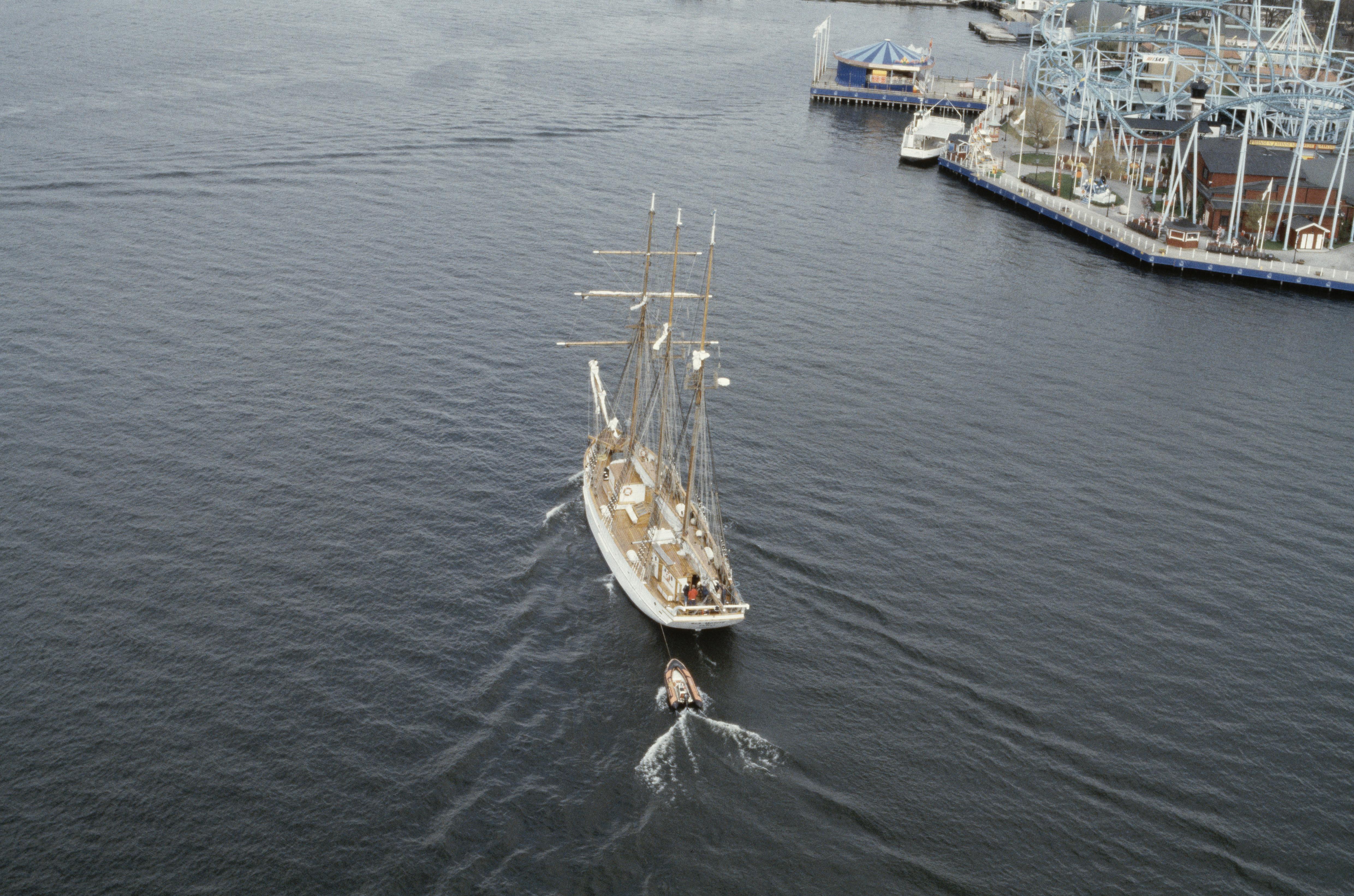 Beskrivning: Båten / segelfartyget "Blå Marité" i Saltsjön vid nöjesfältet Gröna Lund. Bilden är tagen mot (väderstreck): NNV