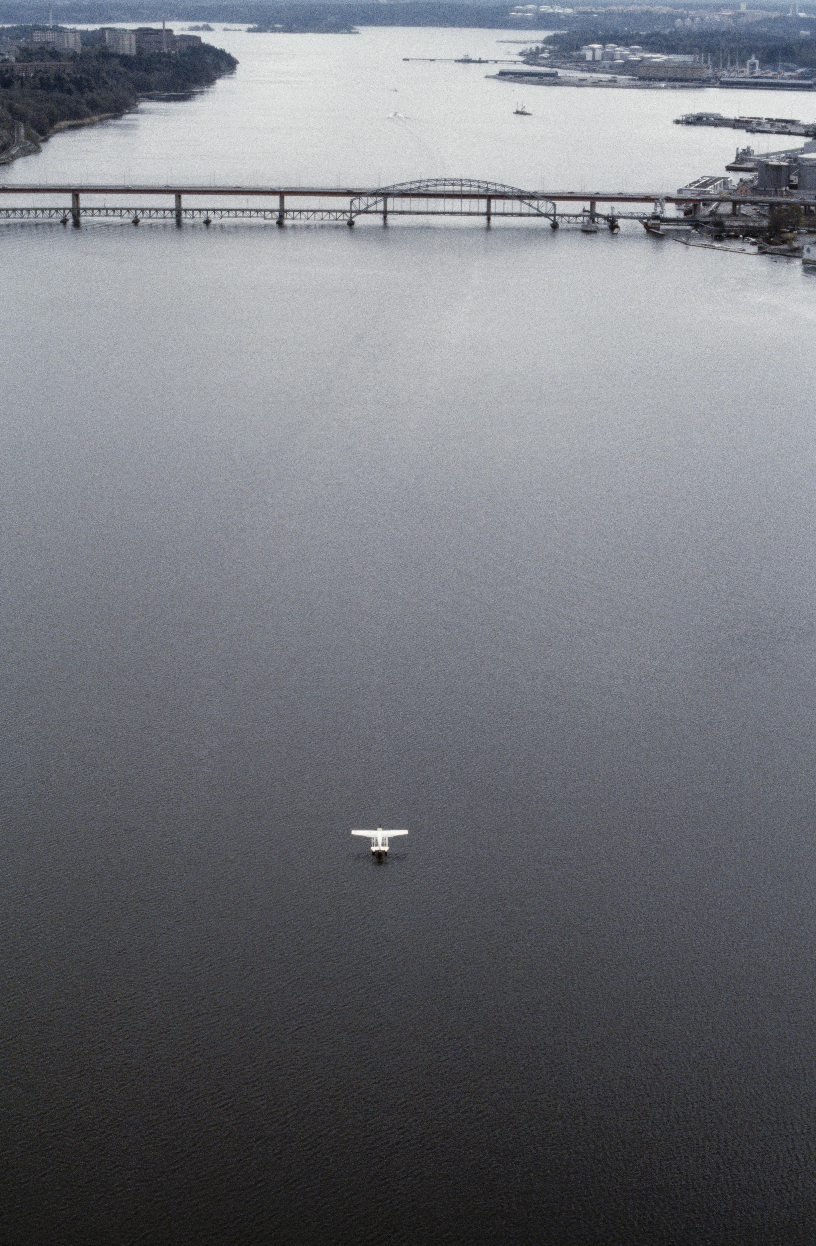 Beskrivning: Sjöflyg över fjärden Lilla Värtan vid Lidingöbron mellan Lidingö uppe till vänster och Norra Djurgården uppe till höger. I bildens övre del Ropsten och Värtahamnen till höger. Bilden är tagen mot (väderstreck): SO