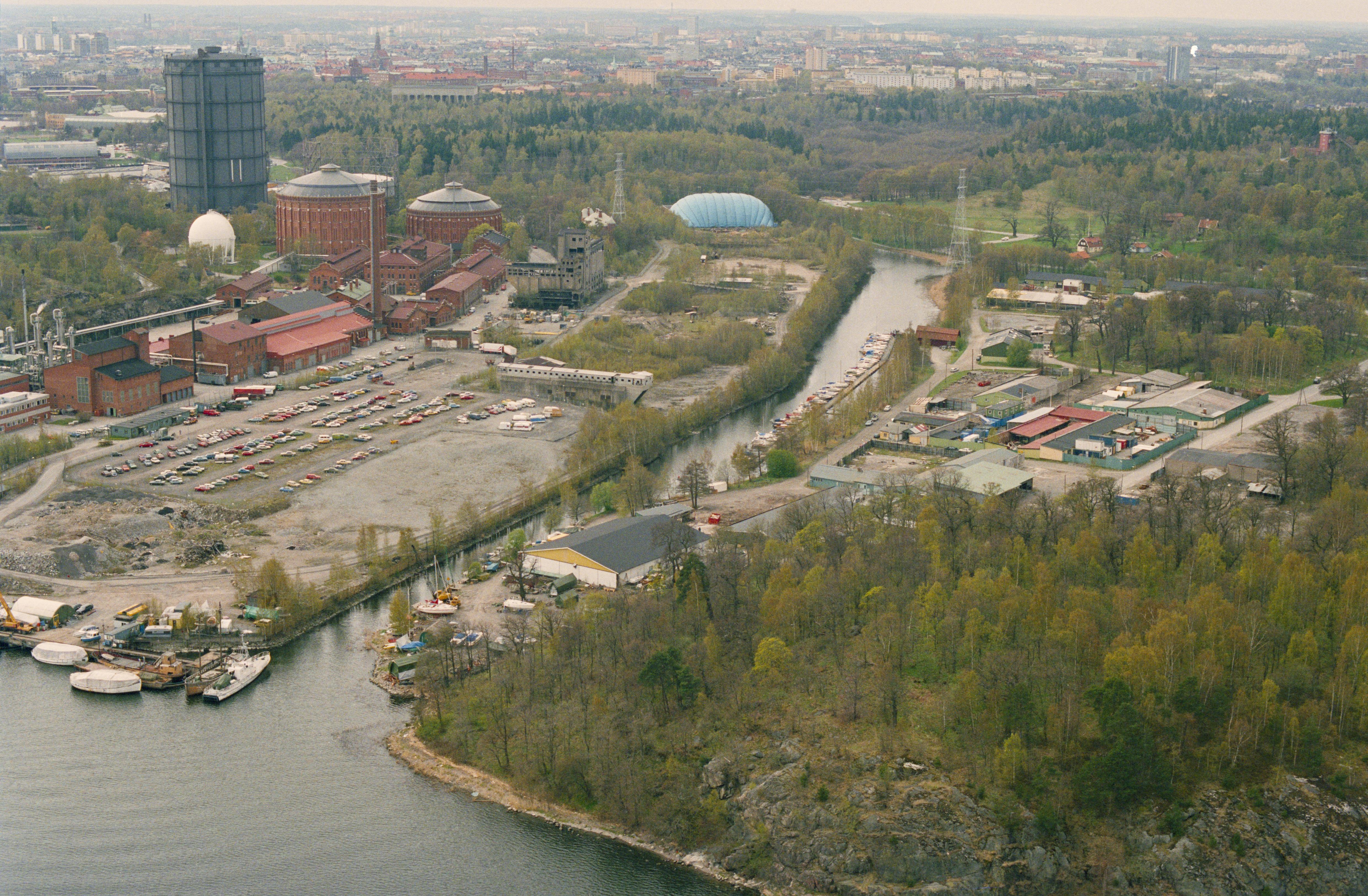 Beskrivning: Fjärden Lilla Värtan och Husarviken vid Hjorthagen, Värtagasverket uppe till vänster. Nere till höger röse och hög RAÄnr Stockholm 11:1-2. Bilden är tagen mot (väderstreck): SSV
