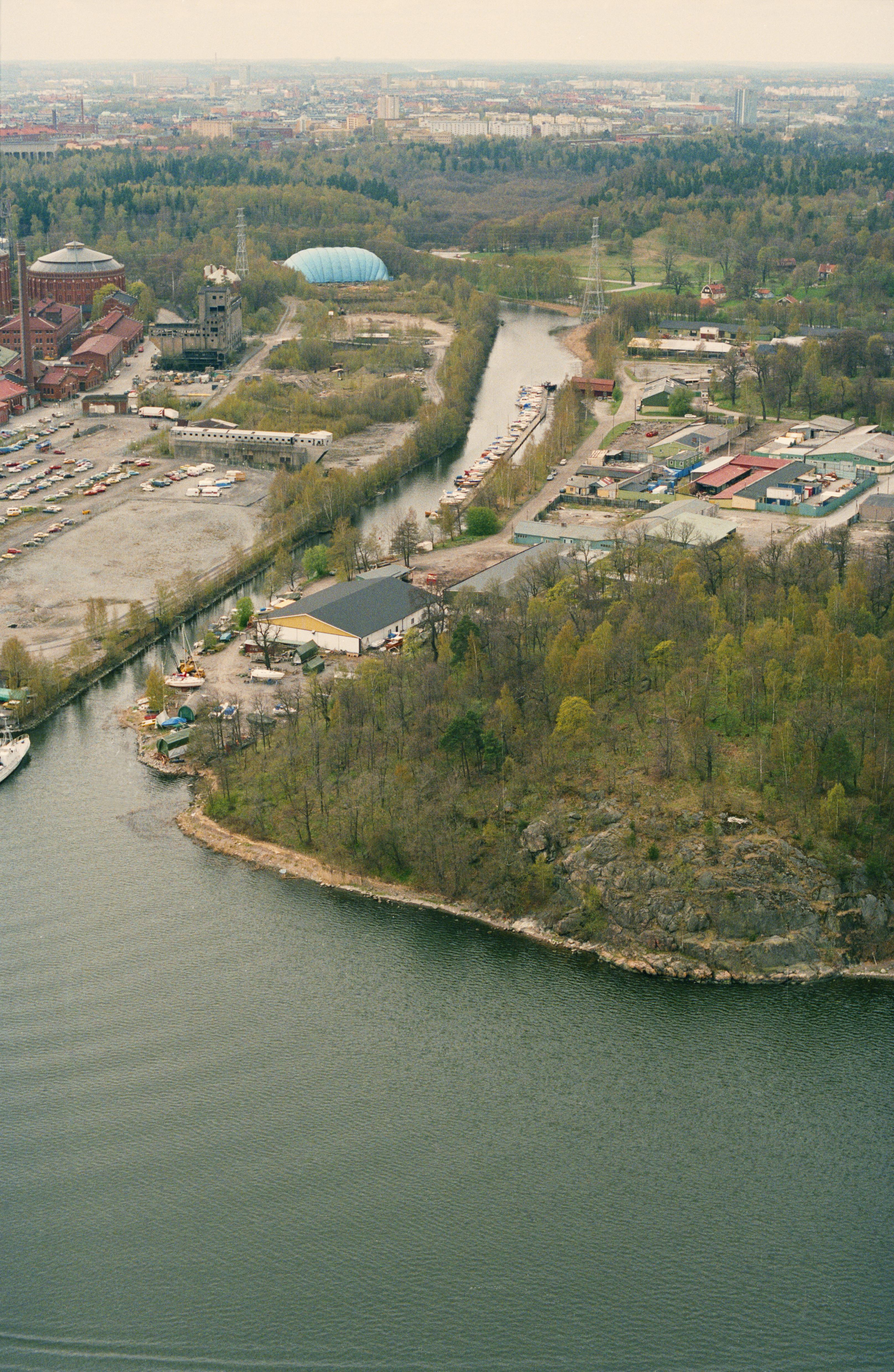 Beskrivning: Fjärden Lilla Värtan och Husarviken vid Hjorthagen, Värtagasverket uppe till vänster. Nere till höger röse och hög RAÄnr Stockholm 11:1-2. Bilden är tagen mot (väderstreck): SSV