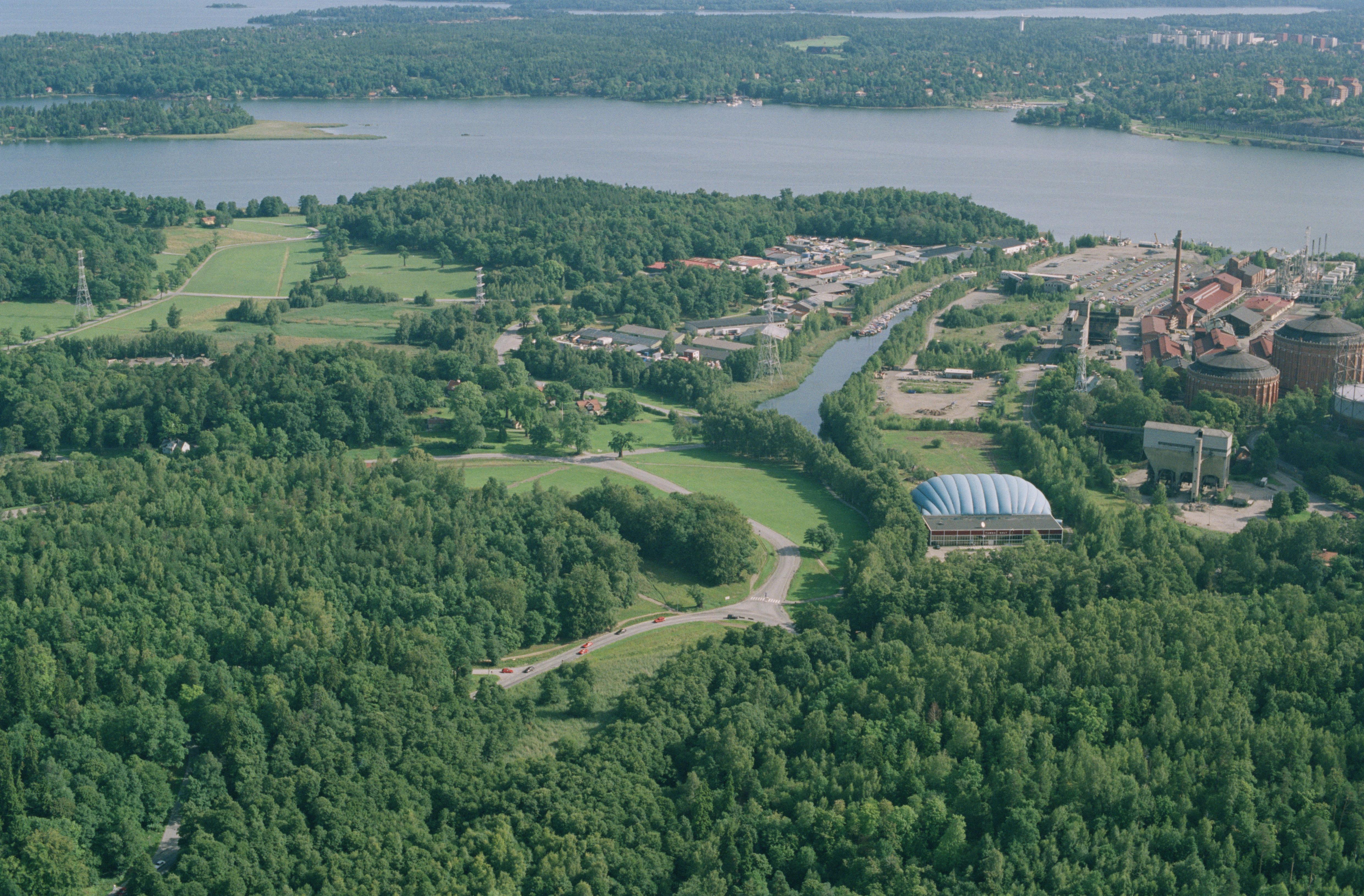 Beskrivning: Husarviken vid Hjorthagen, Värtagasverket till höger om bilden mitt. I bildens övre del fjärden Lilla Värtan mot Lidingö. Bilden är tagen mot (väderstreck): NO