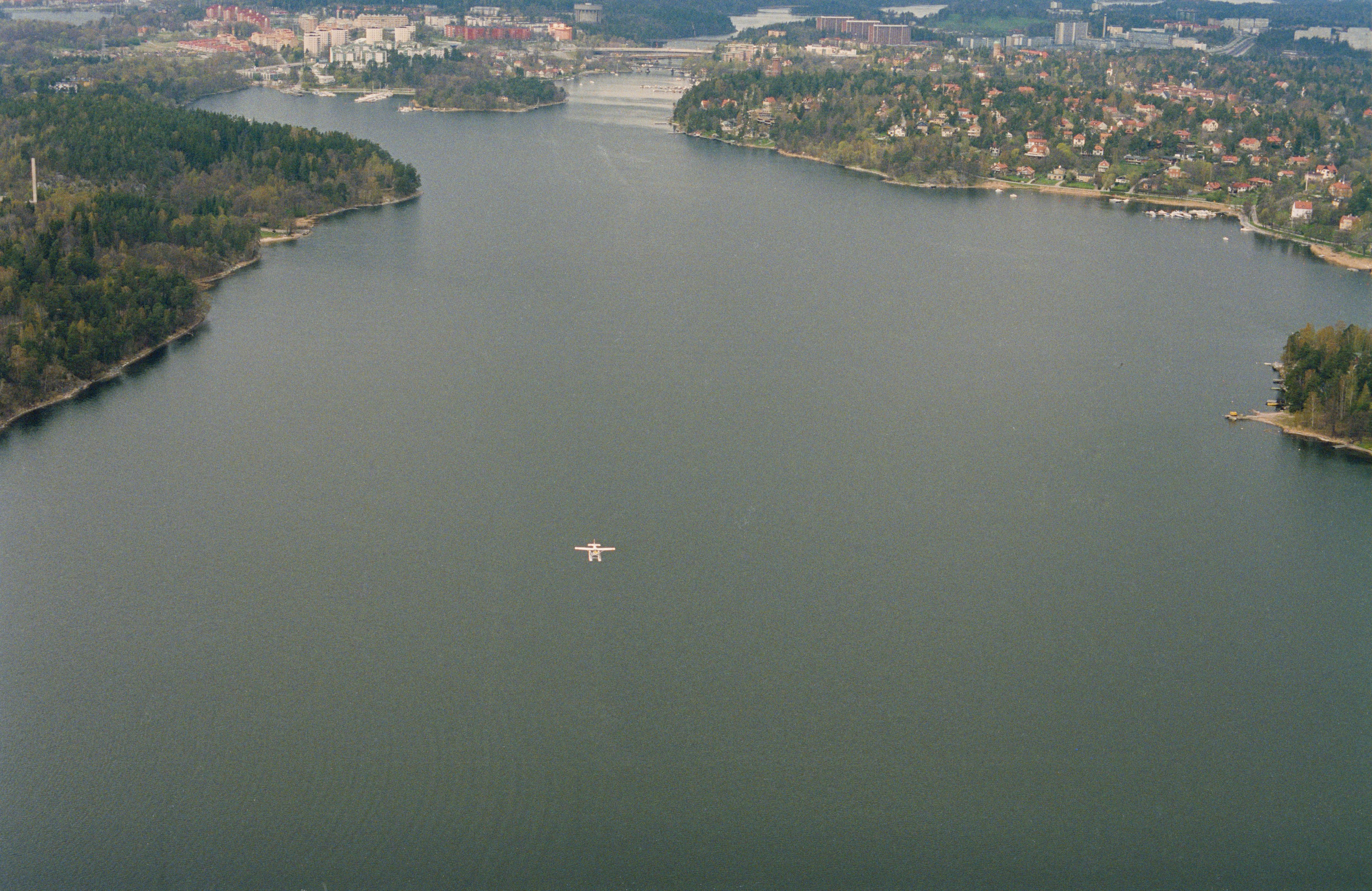 Beskrivning: Sjöflyg över fjärden Lilla Värtan. I bildens övre del från vänster: Norra Djurgården i Stockholm, Bockholmen i Solna socken och Söderskogen i Danderyds socken. Bilden är tagen mot (väderstreck): NV
