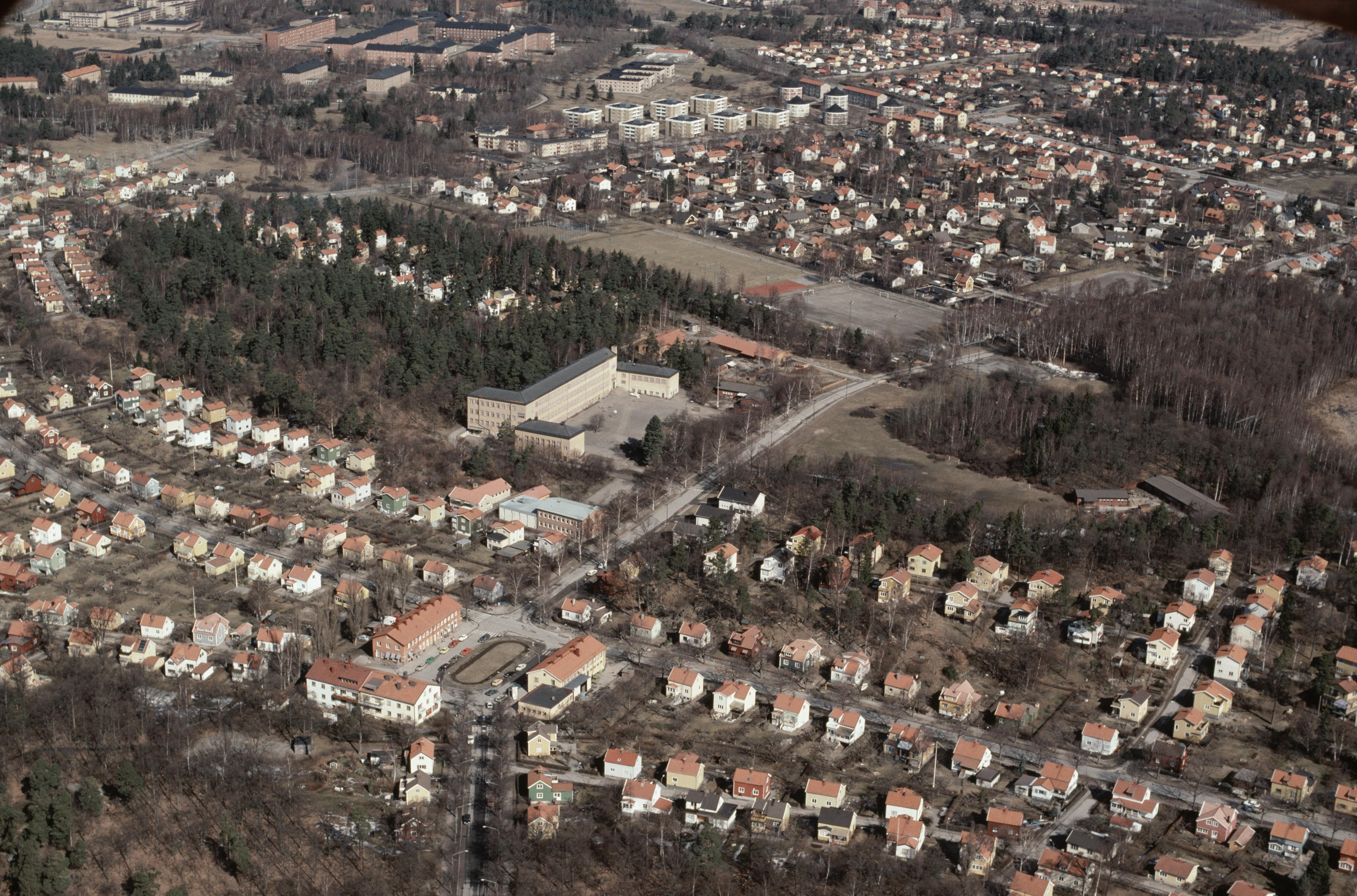 Beskrivning: Stadsdelen Bromma i Stockholms Västerort. Området Norra Ängby. Vid bildens mitt Norra Ängby skole och gravfält RAÄnr Bromma 63:1 m.m. Bilden är tagen mot (väderstreck): NV