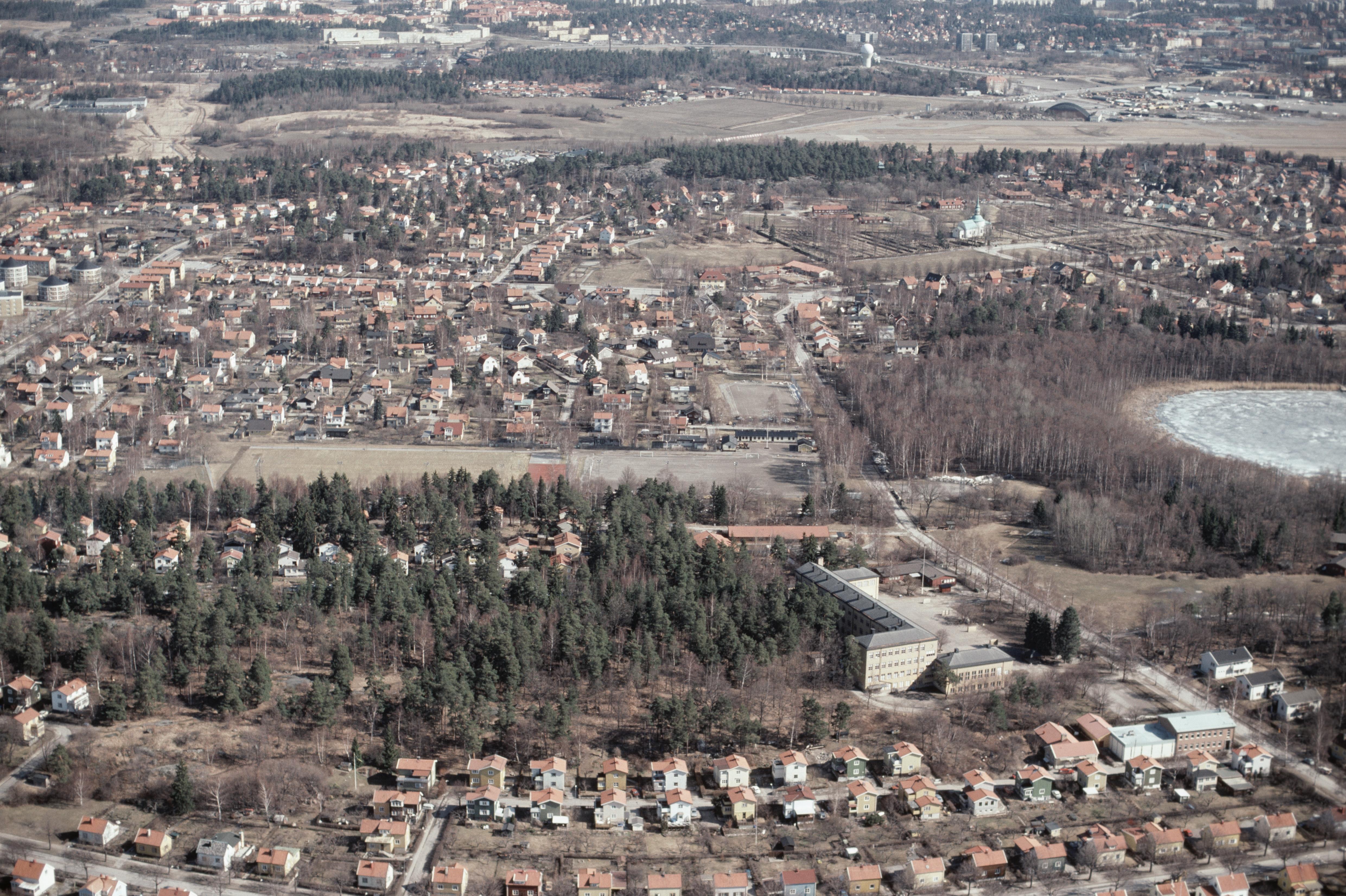Beskrivning: Stadsdelen Bromma i Stockholms Västerort. I bildens nedre del området Norra Ängby. Under bildens mitt gravfält RAÄnr Bromma 63:1 m.m. vid Norra Ängby skola. Till höger Kyrksjön och Bromma kyrka med medeltida kyrkotomt RAÄnr Stockholm 992. Bilden är tagen mot (väderstreck): NO