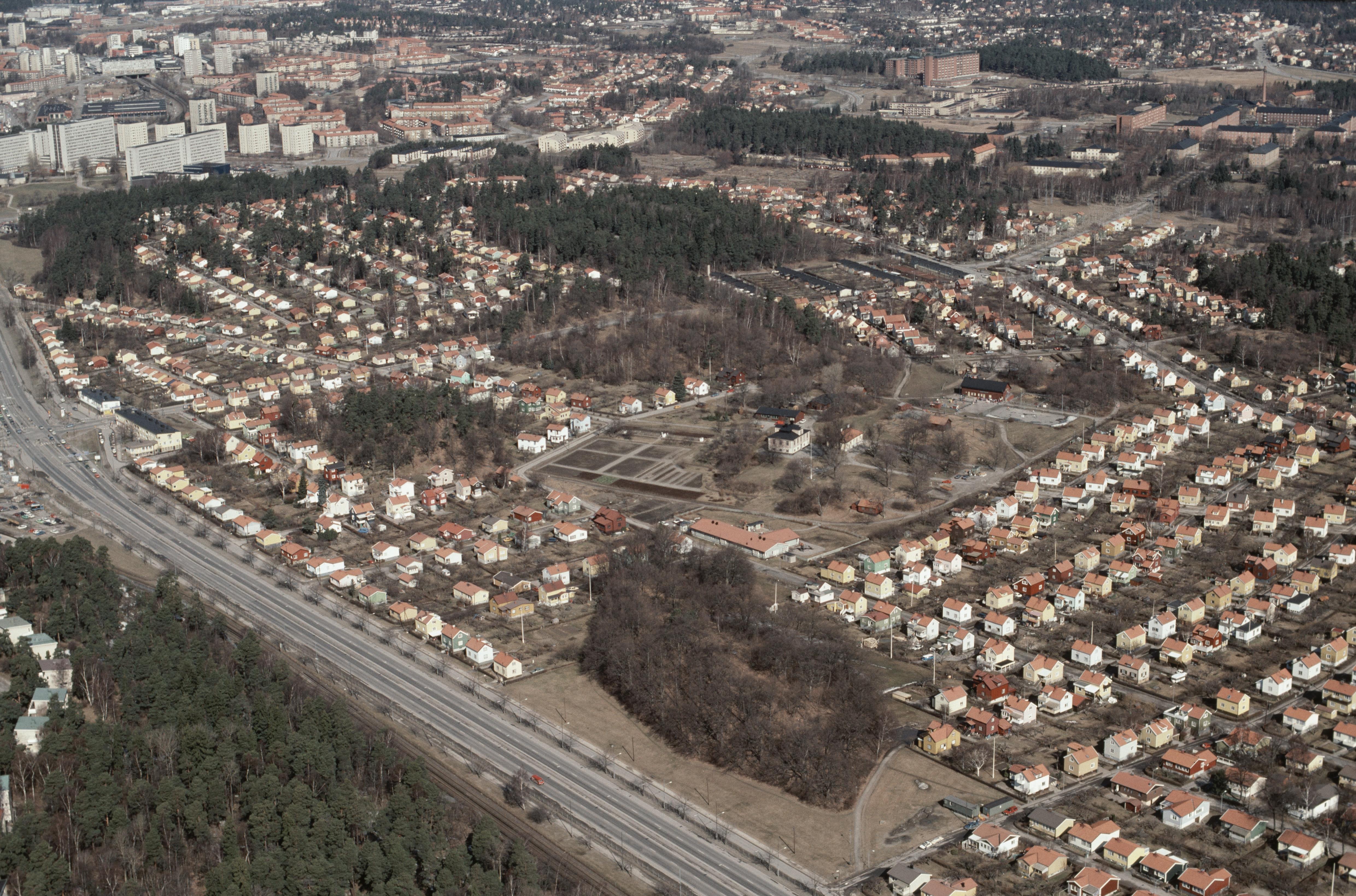 Beskrivning: Området Norra Ängby i stadsdelen Bromma i Stockholms Västerort. Bergslagsvägen nere till vänster. Vid bildens mitt Stora Ängby herrgård och gravfält Björklunds hage RAÄnr Bromma 62:1. Bilden är tagen mot (väderstreck): NNV