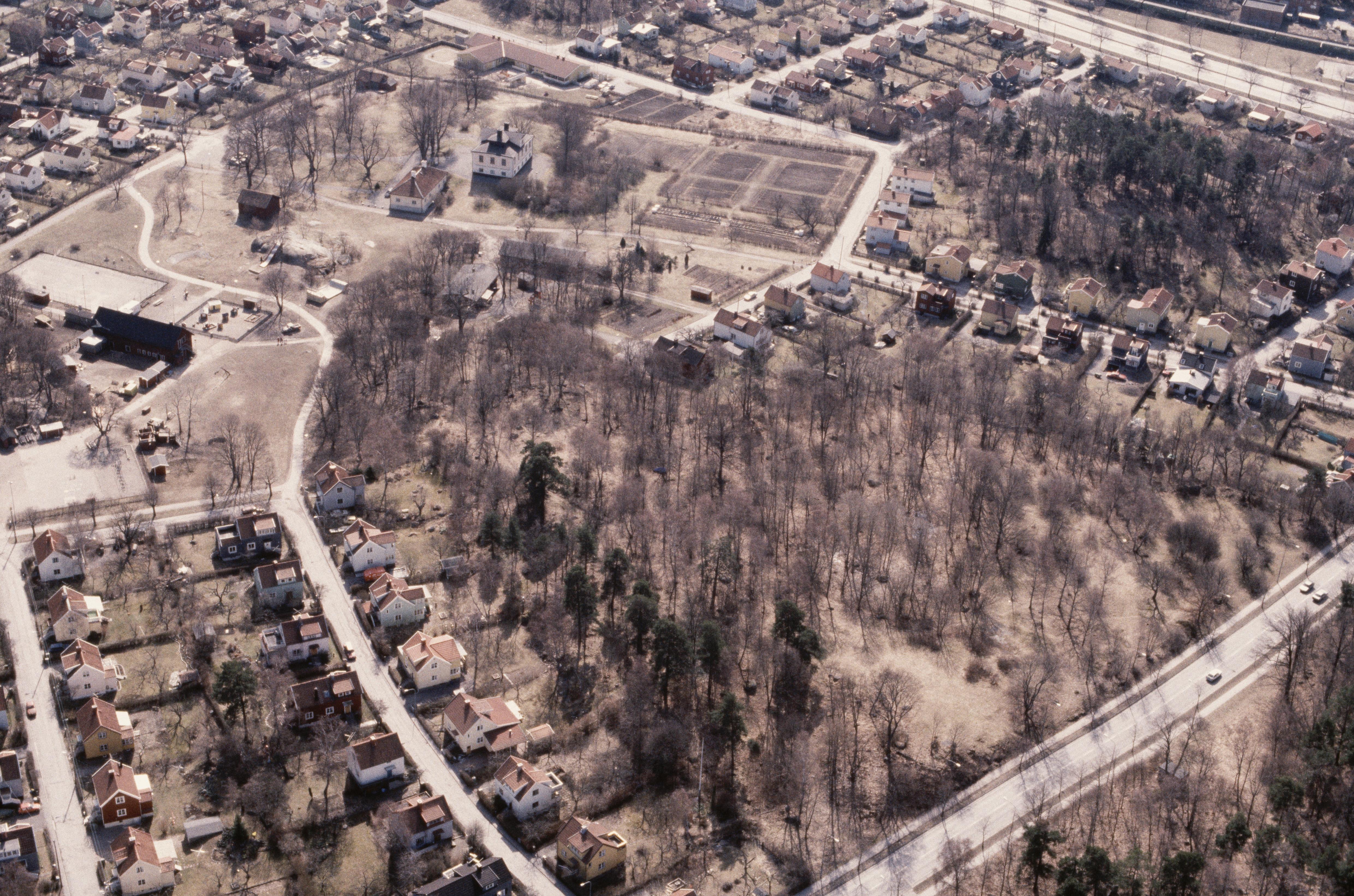 Beskrivning: Området Norra Ängby i stadsdelen Bromma i Stockholms Västerort. Vid bildens mitt gravfält Björklunds hage RAÄnr Bromma 62:1. Till vänster Stora Ängby herrgård i Norra Ängby. Bilden är tagen mot (väderstreck): SO