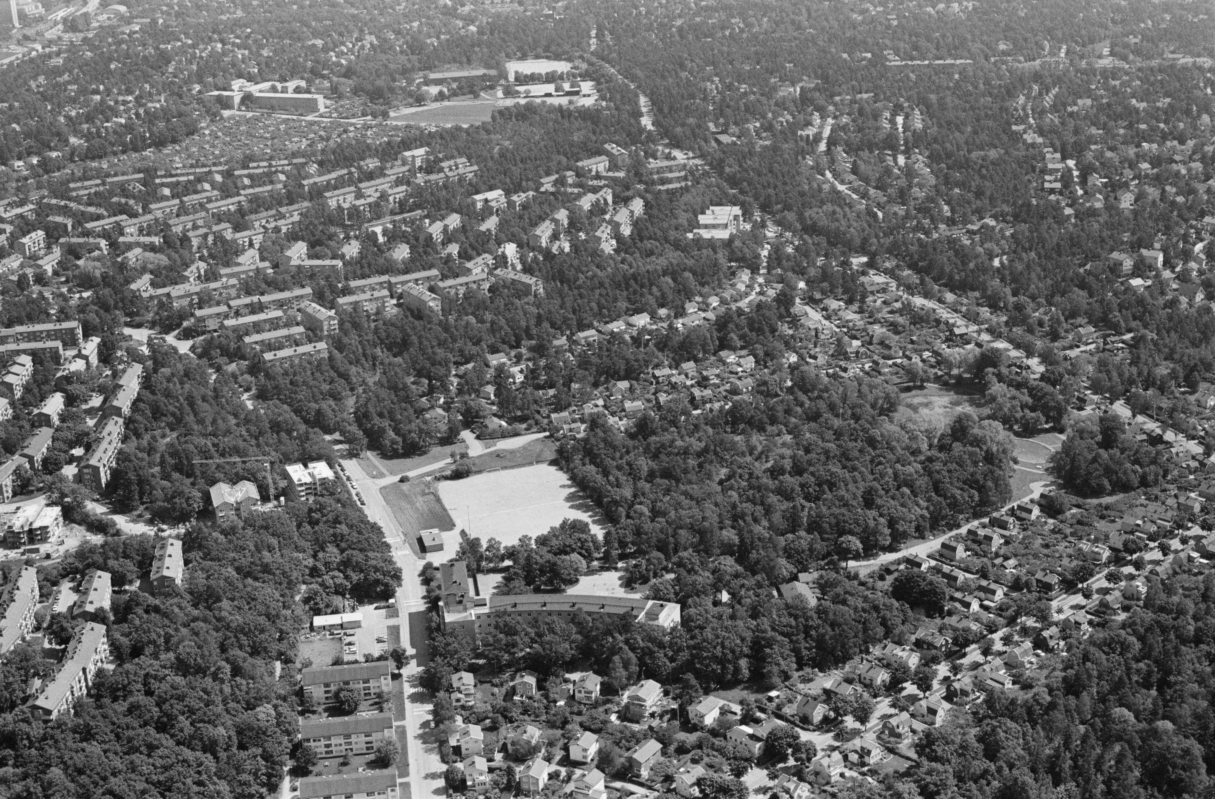 Beskrivning: Området Olovslund i stadsdelen Bromma i Stockholms Västerort. Till höger om bildens mitt Olovslunden med stensättningar RAÄnr Bromma 10:1-2. Bilden är tagen mot (väderstreck): OSO