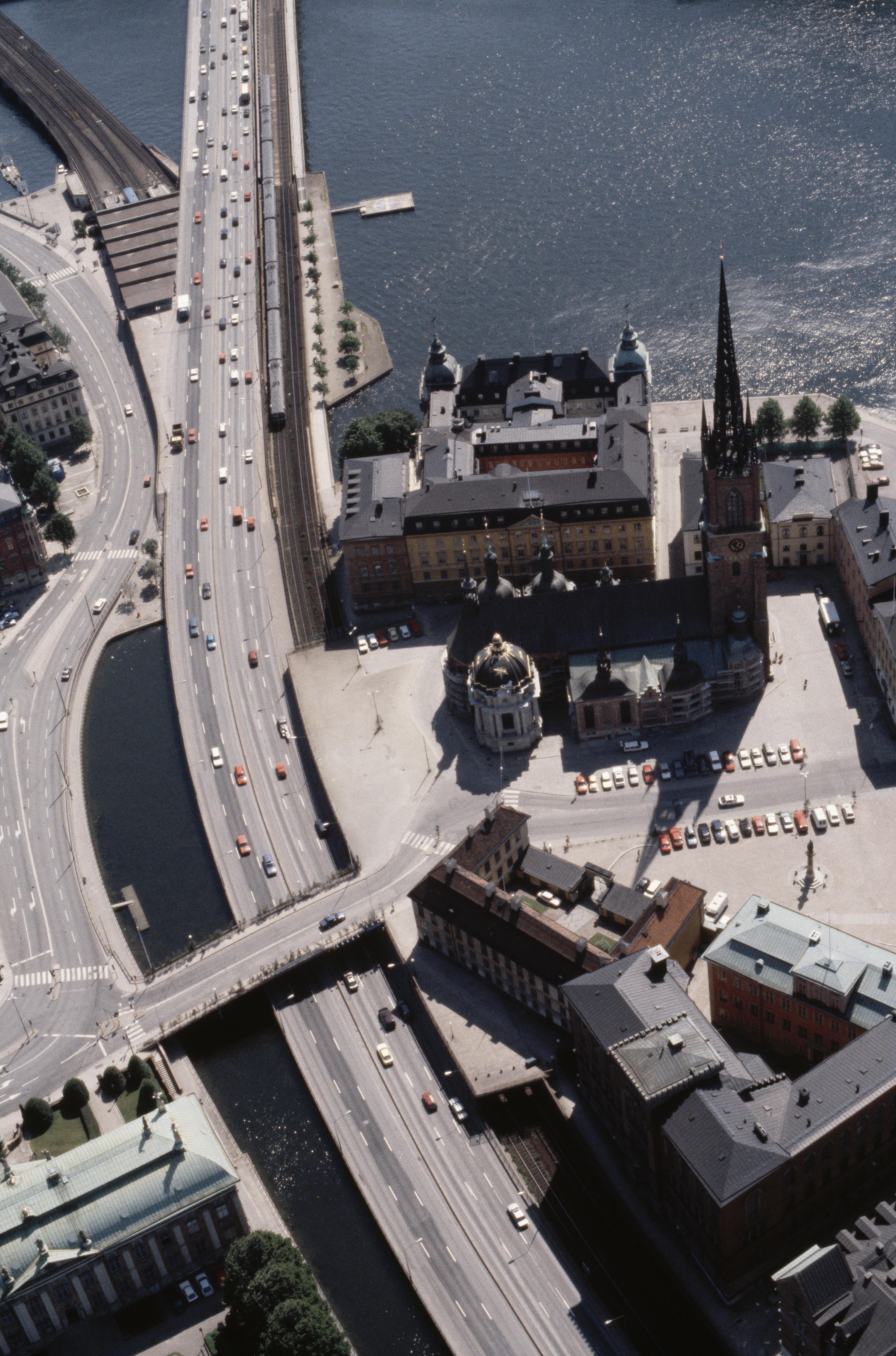 Beskrivning: Vägen "Tredje spåret" över Mälaren mot Centralbron mellan Gamla stan till vänster och Riddarholmen till höger. Riddarholmskyrkan - statligt byggnadsminne RAÄnr Stockholm 121:1. Bilden är tagen mot (väderstreck): SSO