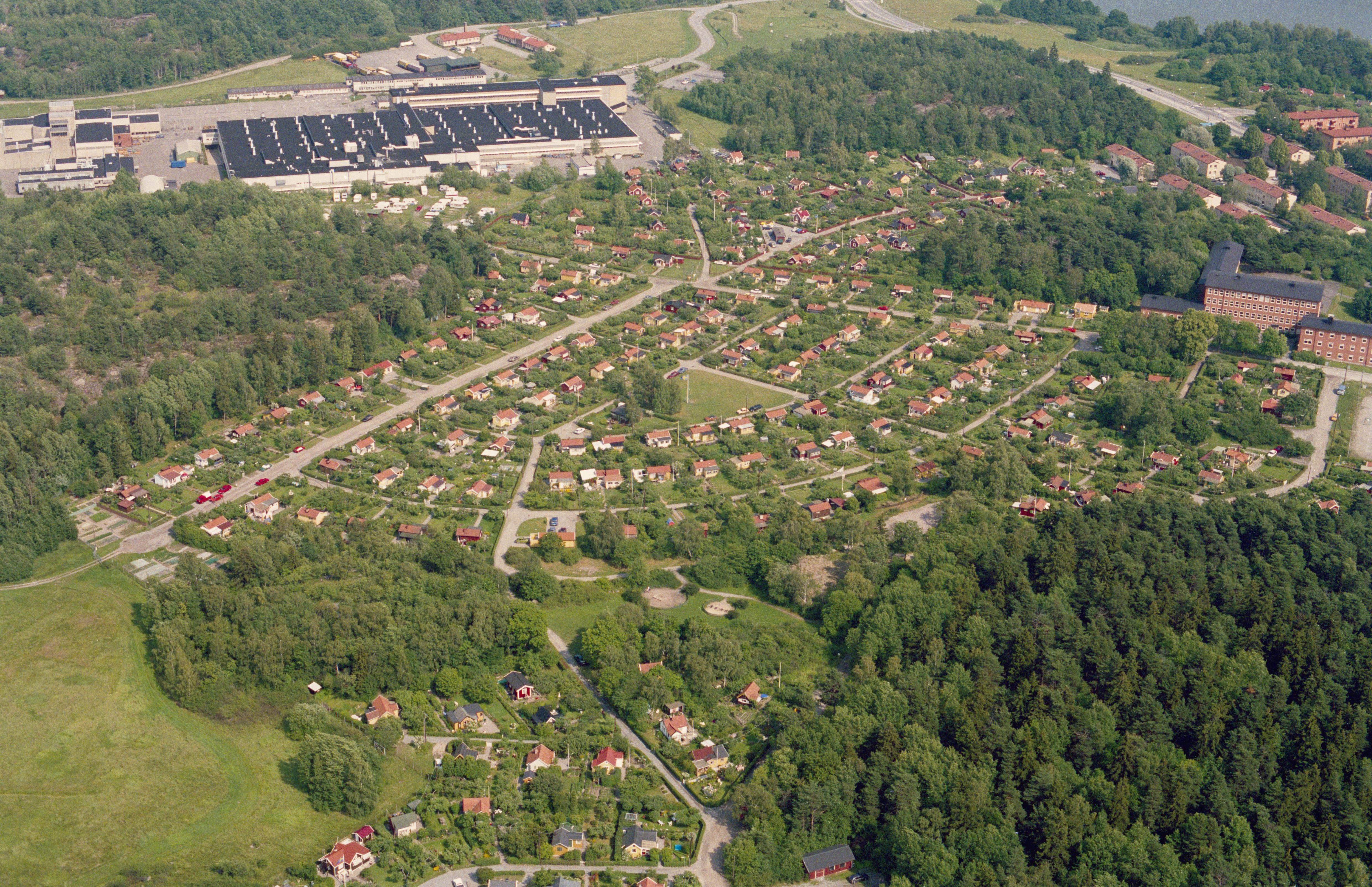 Beskrivning: Riksby koloniområde i stadsdelen Bromma i Stockholms Västerort. Uppe till höger Lillsjön. Nere till höger gravfält RAÄnr Bromma 16:1. Bilden är tagen mot (väderstreck): OSO