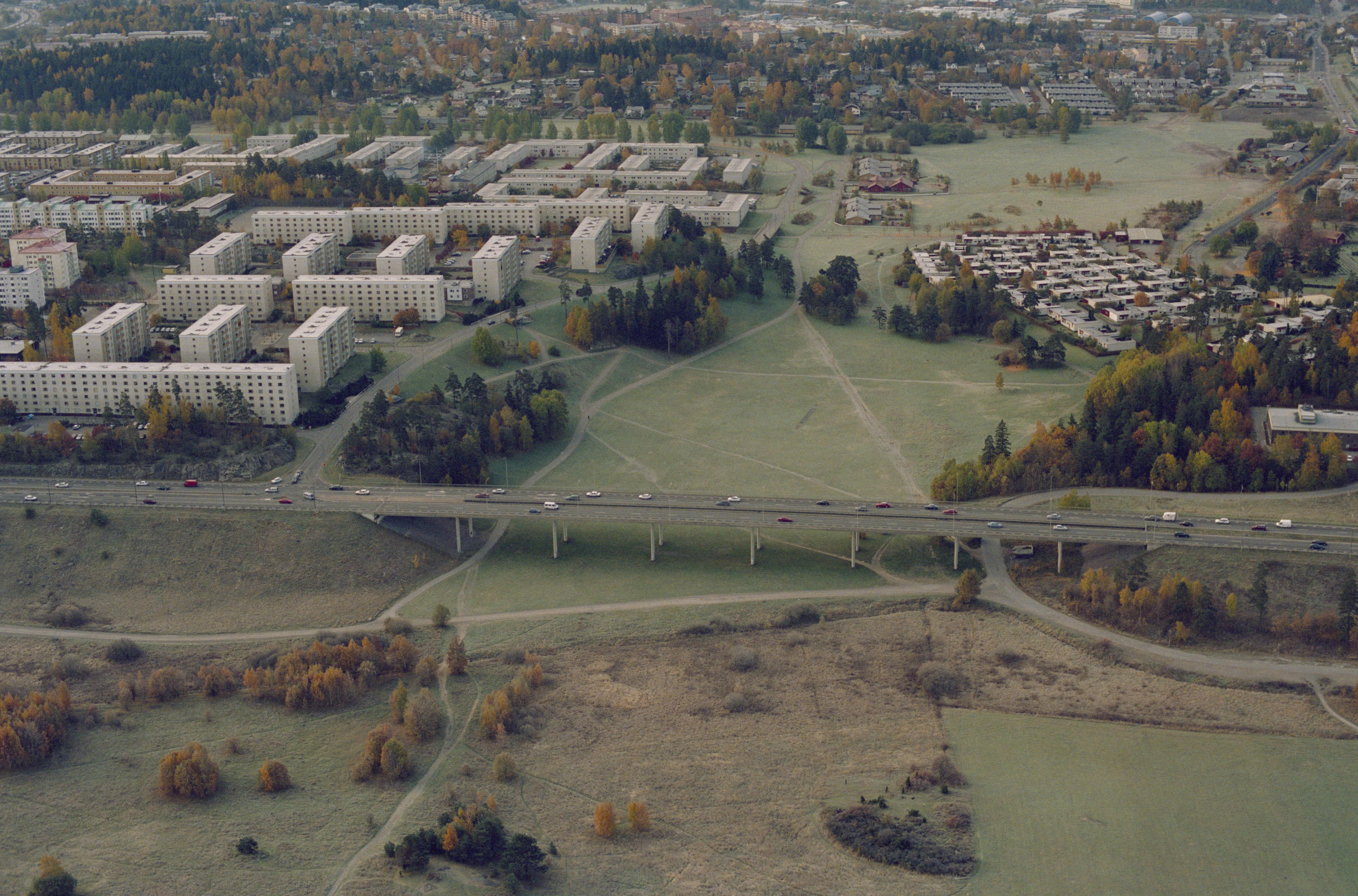 Beskrivning: (Tid. Spånga socken). Viadukt på väg E18 mellan Rinkeby - Spånga. Spånga kyrka i bildens högra kant. Bilden är tagen mot (väderstreck): SV