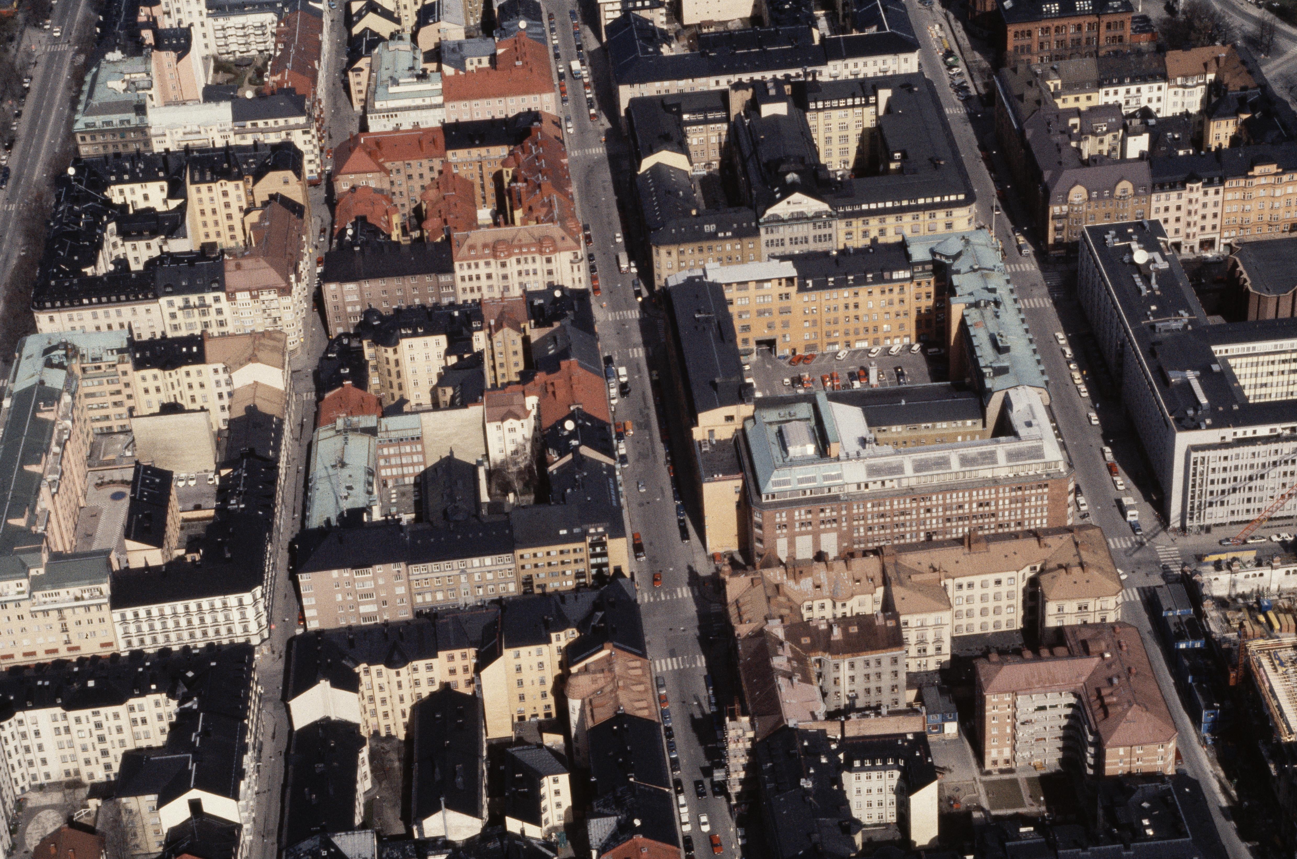 Beskrivning: Norrmalm. Gatorna Sveavägen (uppe till vänster), Luntmakargatan, Döbelnsgatan, Tulegatan, Kungstensgatan, Rådmansgatan, Tegnérgatan m.m. Bilden är tagen mot (väderstreck): NNV