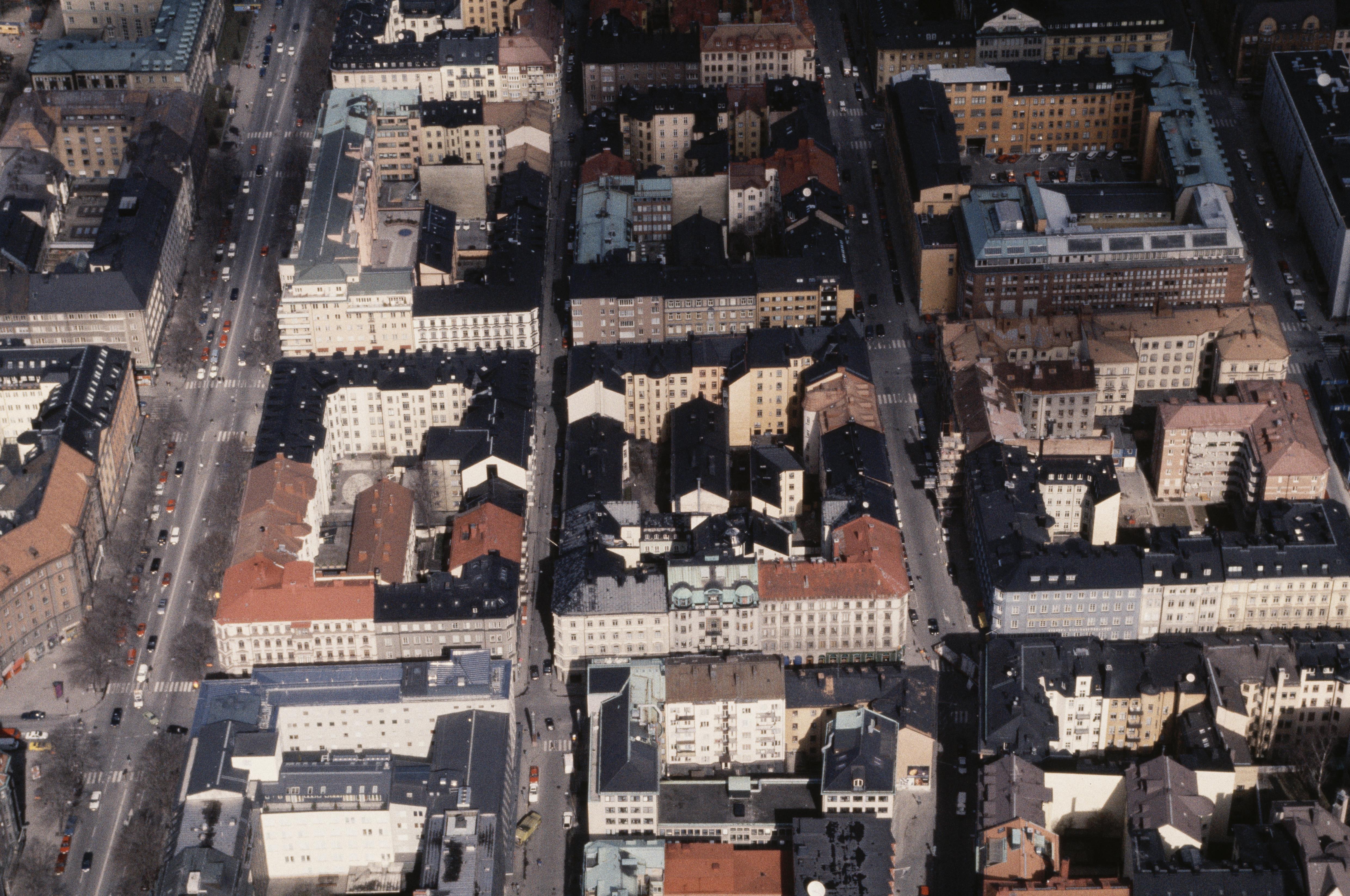 Beskrivning: Norrmalm. Gatorna Sveavägen, Luntmakargatan, Döbelnsgatan, Kungstensgatan, Rådmansgatan, Tegnérgatan m.fl. vid Kvarteret Jägaren m.m. Bilden är tagen mot (väderstreck): NNV