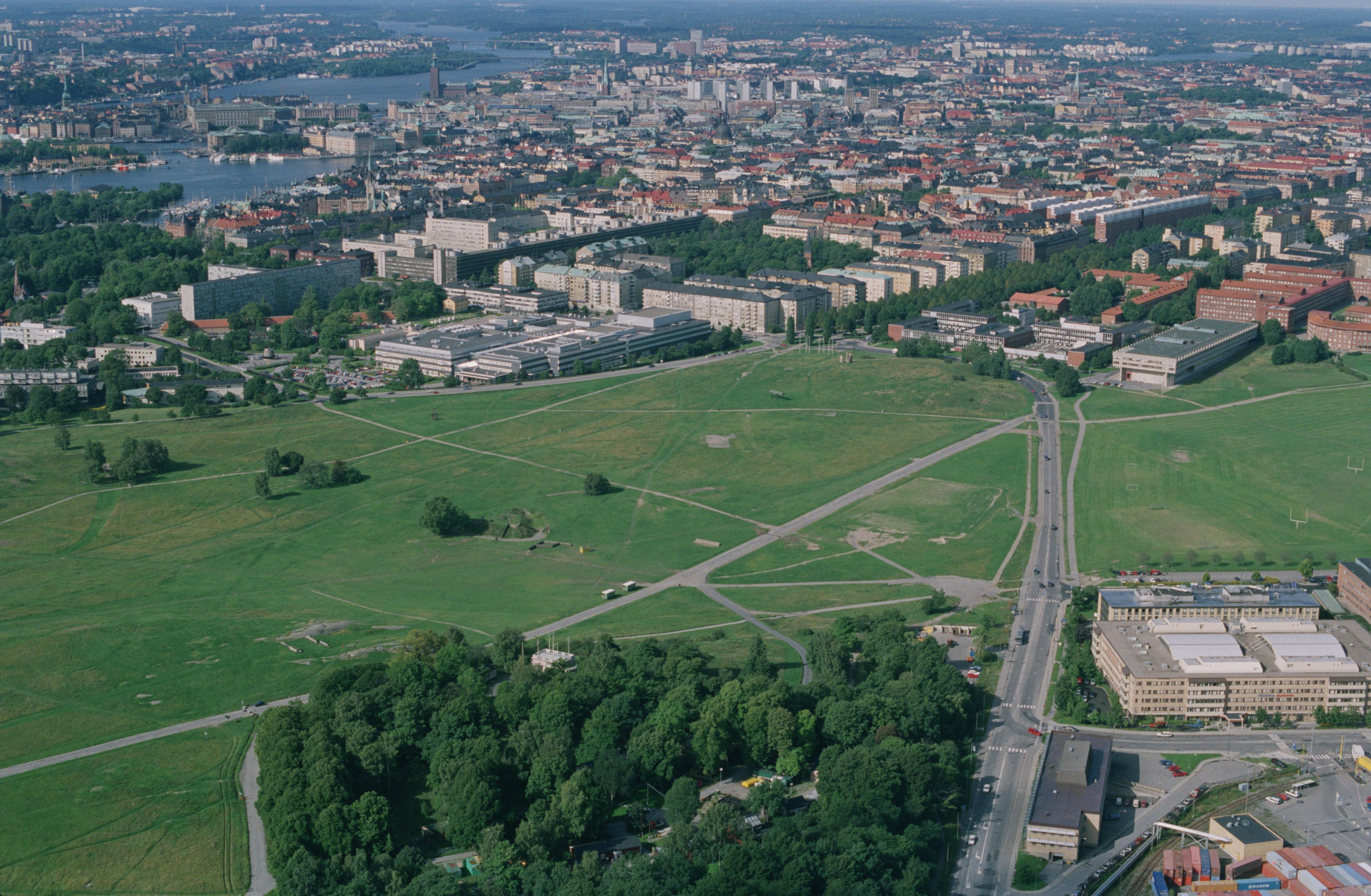 Beskrivning: Gärdet. Ladugårdsgärdet, Östermalm, Djurgården. I bildens övre del Gamla stan, Södermalm, m.m. Bilden är tagen mot (väderstreck): V
