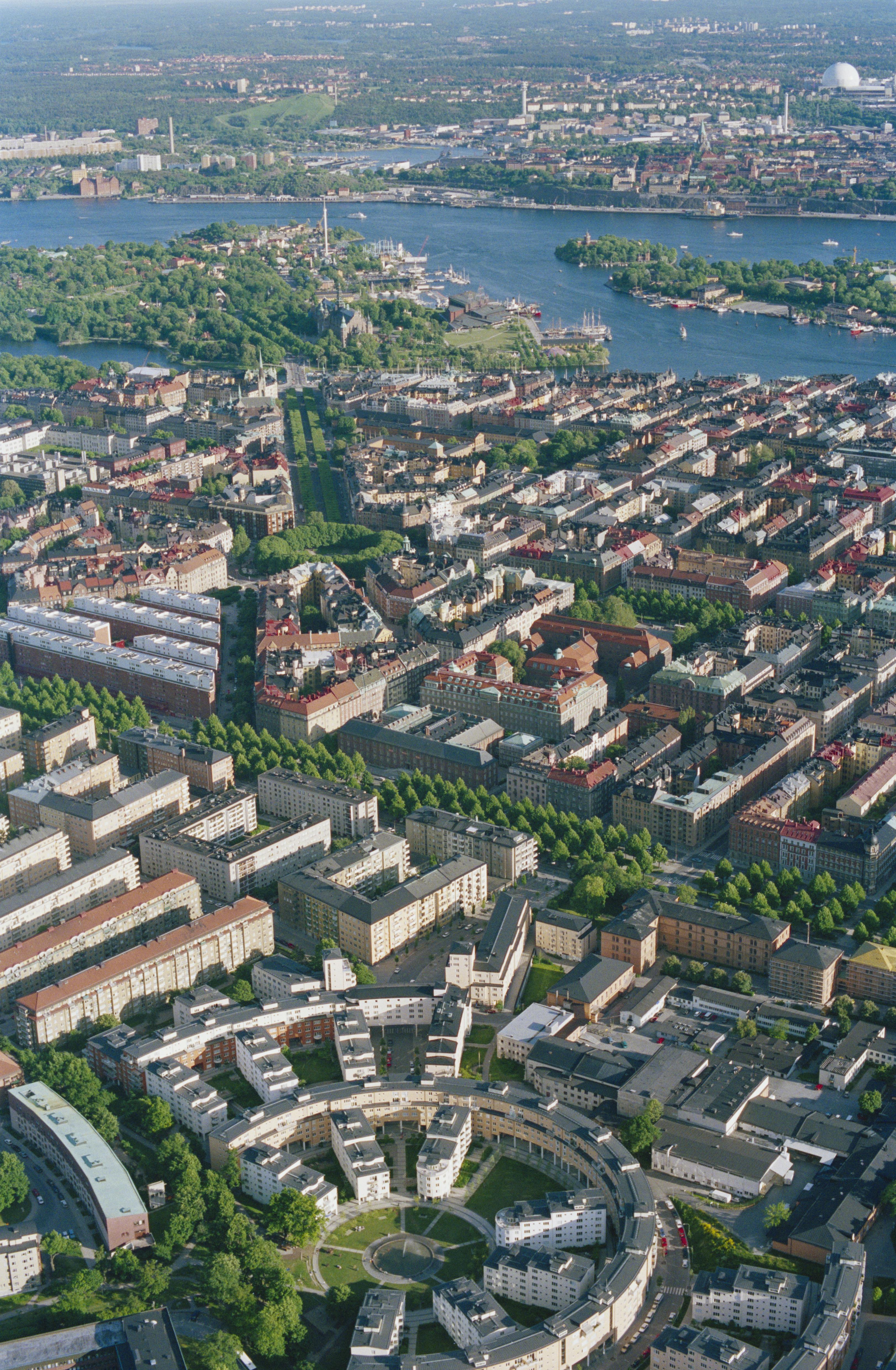Beskrivning: Östermalm. I bildens nedre del bostadsområdet Starrängsringen. Till vänster om bildens mitt köpcentrum- och bostadskvarteret Fältöversten på Karlaplan och Narvavägen mot Kvarteret Krubban och Södra Djurgården. I bildens övre del Saltsjön, Södra Djurgården, Skeppsholmen, Kastellholmen m.m. mot Nacka socken och Johanneshov med Ericsson Globe (Globen), Bilden är tagen mot (väderstreck): SSO
