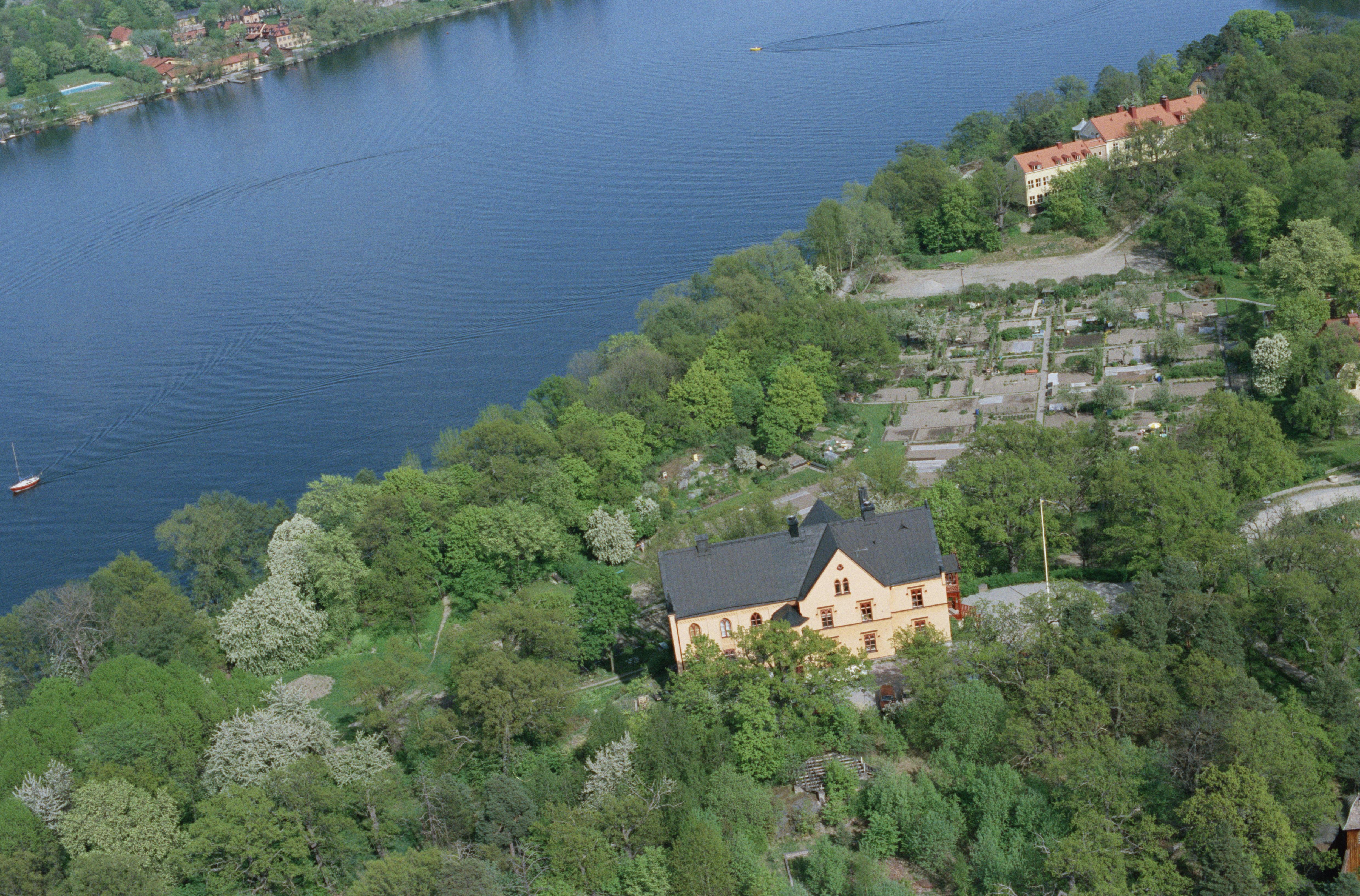 Beskrivning: Stadsdelen Traneberg i Stockholms Västerort. Ulvsundasjön i Mälaren. Johanneslunds gård / herrgård. Under bildens mitt Johannelunds missionskyrka. Nere till höger område med stensättning RAÄnr Stockholm 792. Bilden är tagen mot (väderstreck): Ö