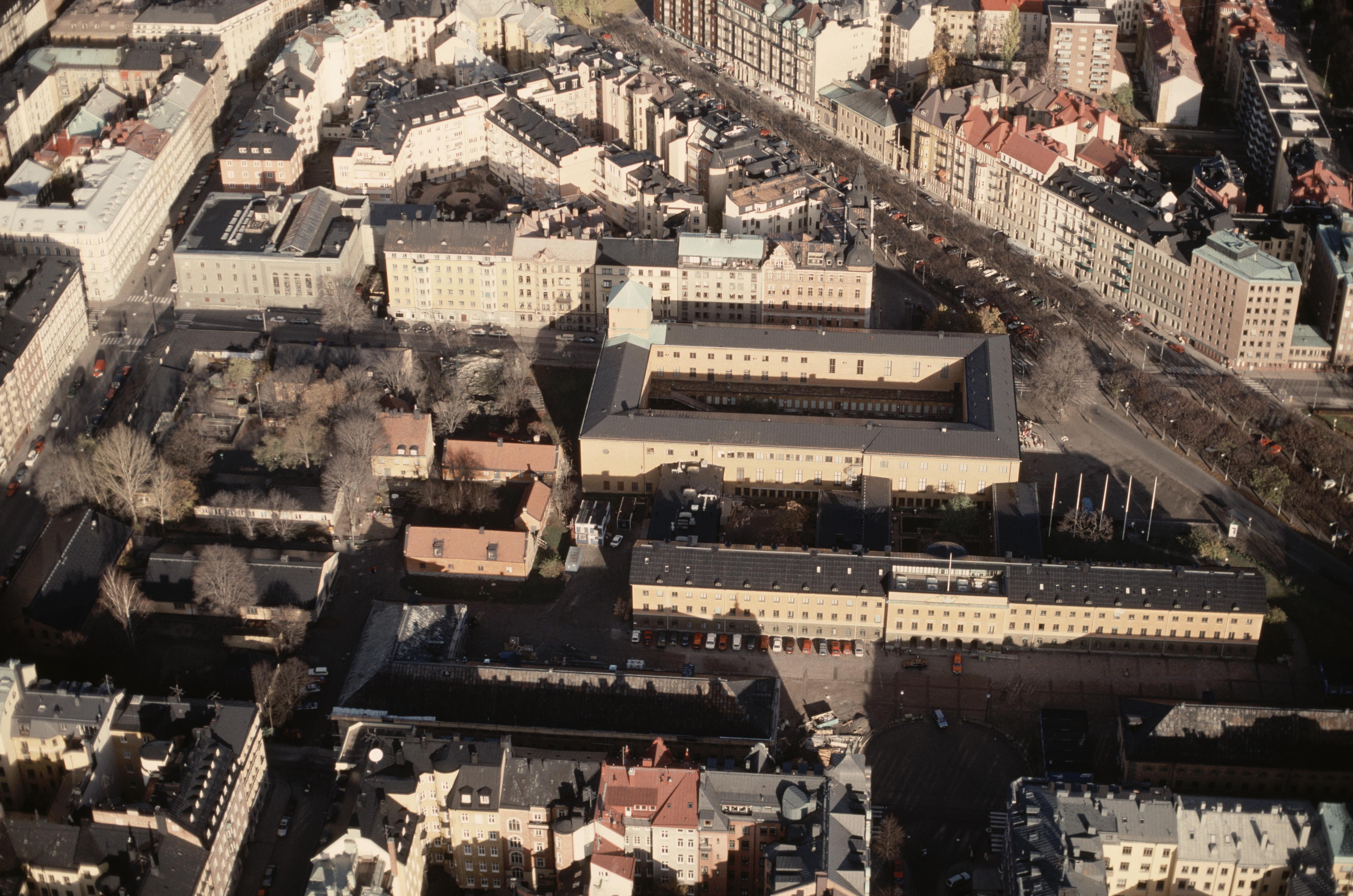 Beskrivning: Östermalm. Styrmansgatan, Storgatan och Narvavägen m.m. Kvarteret Krubban med statligt byggnadsminne Oxenstiernska malmgården - RAÄnr Stockholm 73:1 och Statens Historiska Museum (SHM), Riksantikvarieämbetet, m.m. Bilden är tagen mot (väderstreck): NNO