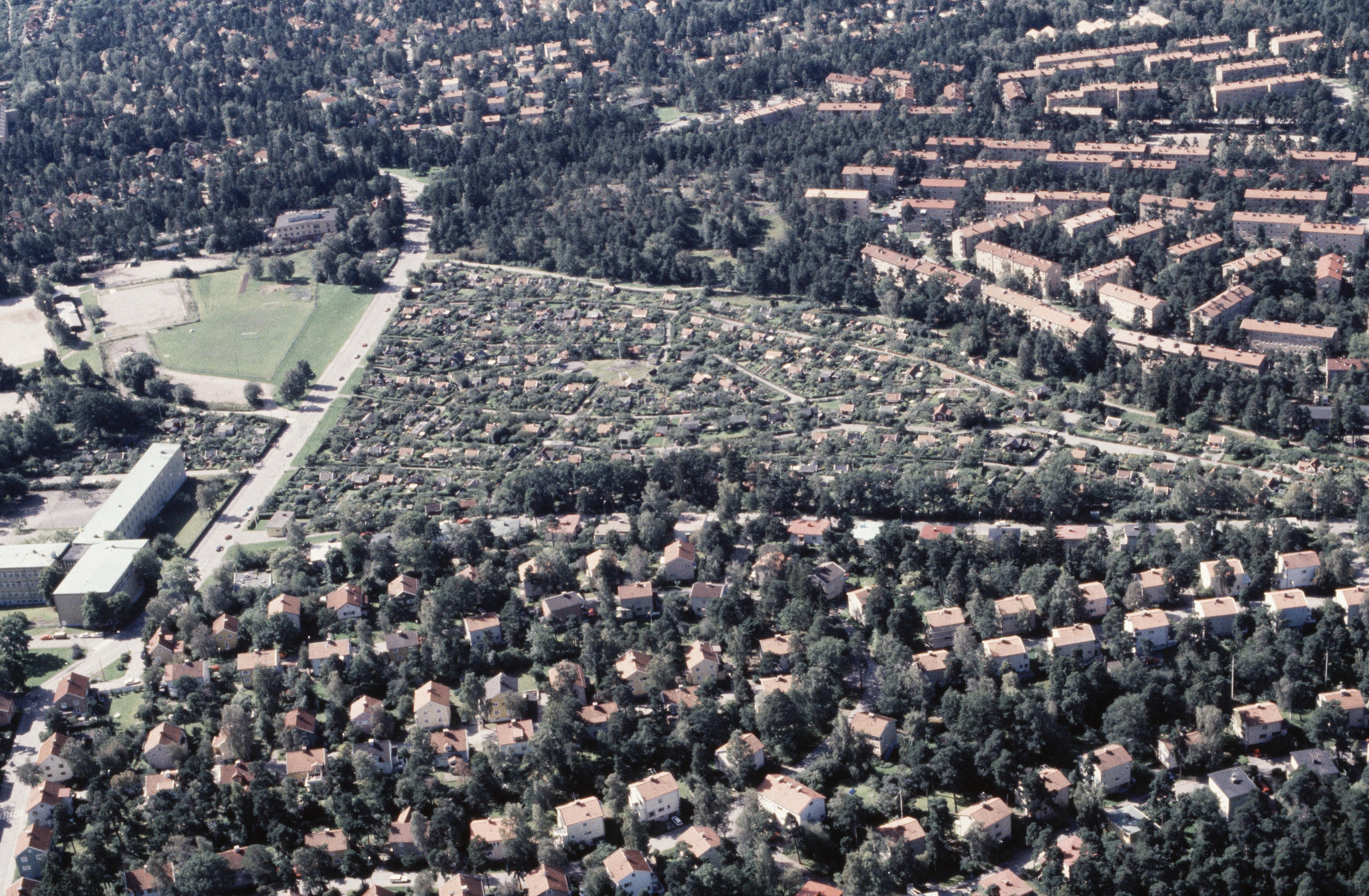 Beskrivning: Området Stora Mossen och Abrahamsberg i stadsdelen Bromma i Stockholms Västerort. Vid bildens mitt Stora Mossens koloniområde. Bilden är tagen mot (väderstreck): S