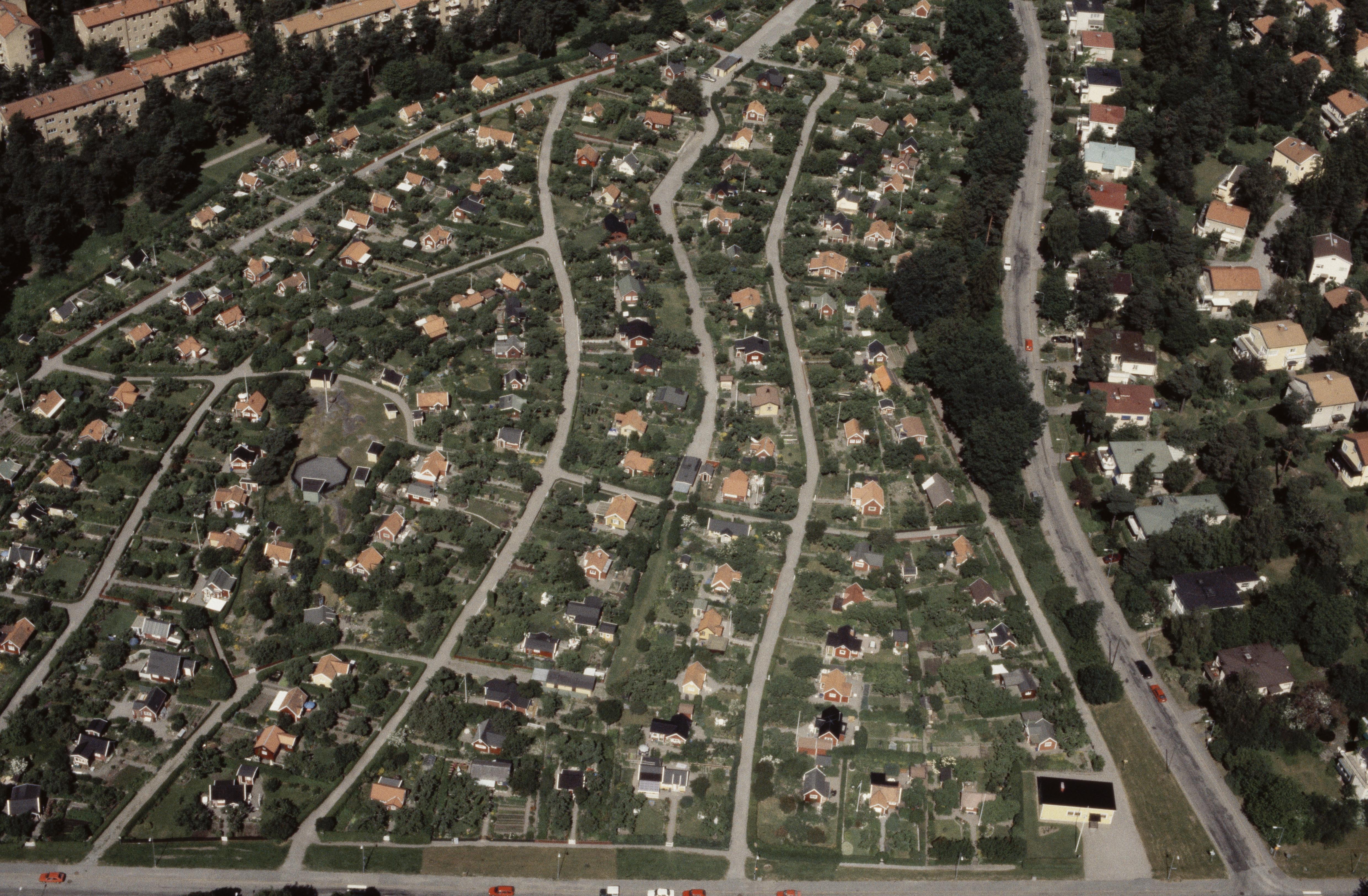 Beskrivning: Området Stora Mossen och Abrahamsberg i stadsdelen Bromma i Stockholms Västerort. Vid bildens mitt Stora Mossens koloniområde. Bilden är tagen mot (väderstreck): NNV