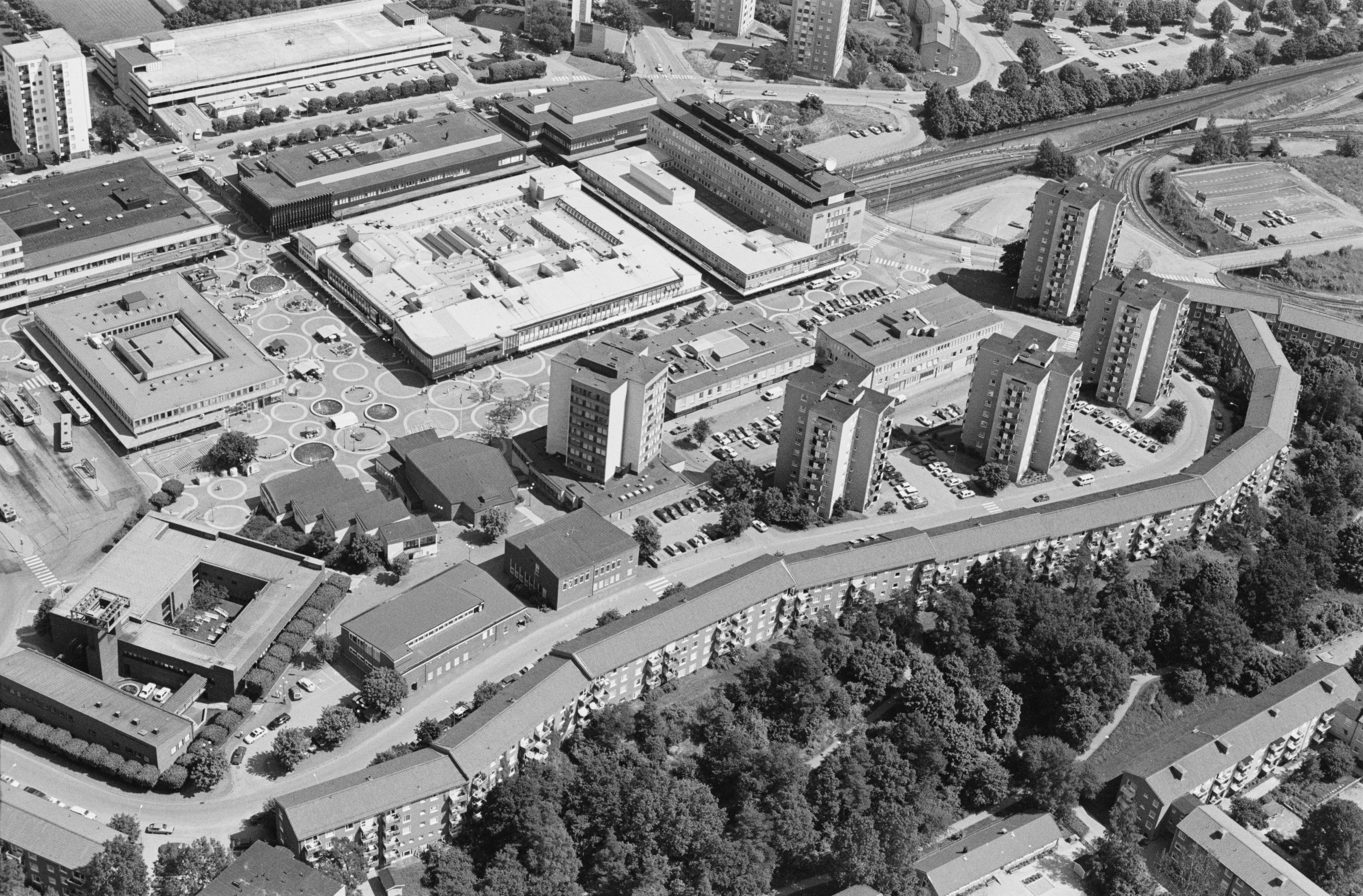 Beskrivning: Området Vällingby i stadsdelen Hässelby-Vällingby i Stockholms Västerort. Nere till vänster Sankt Tomas kyrka vid Vällingbytorget. Bilden är tagen mot (väderstreck): ONO