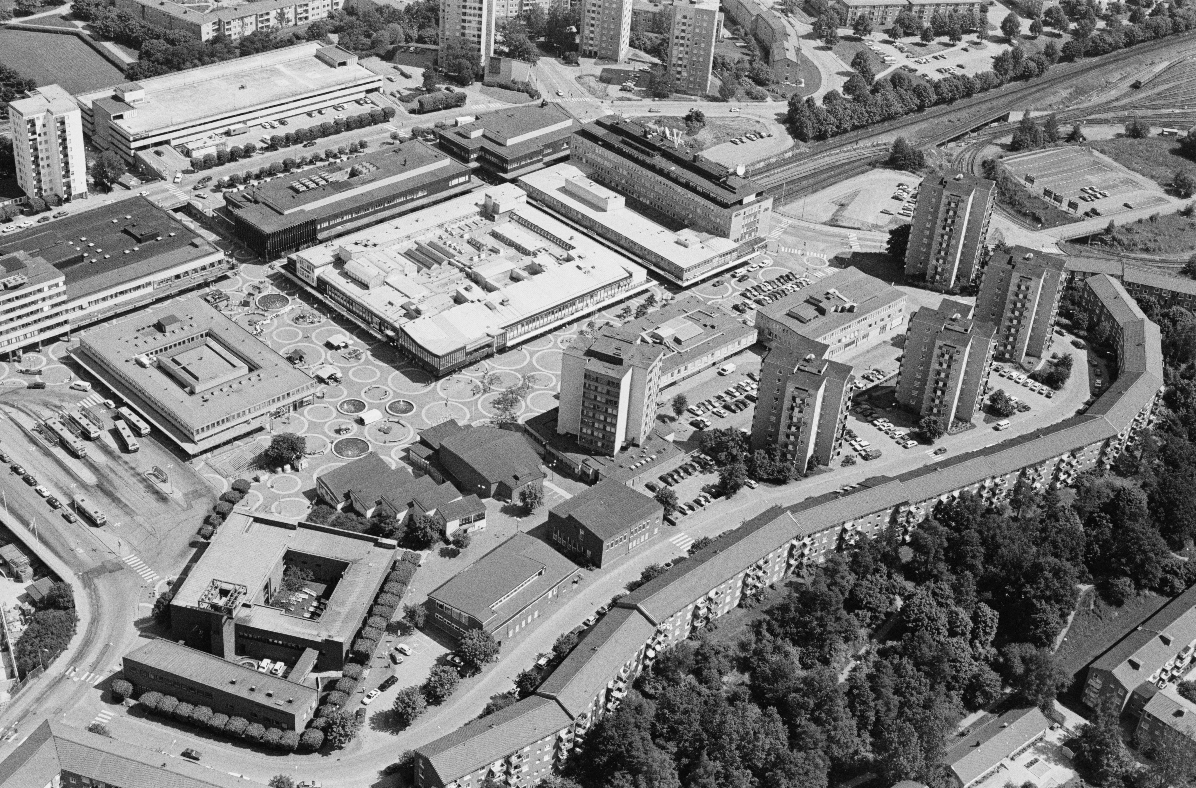 Beskrivning: Området Vällingby i stadsdelen Hässelby-Vällingby i Stockholms Västerort. Nere till vänster Sankt Tomas kyrka vid Vällingbytorget. Bilden är tagen mot (väderstreck): ONO