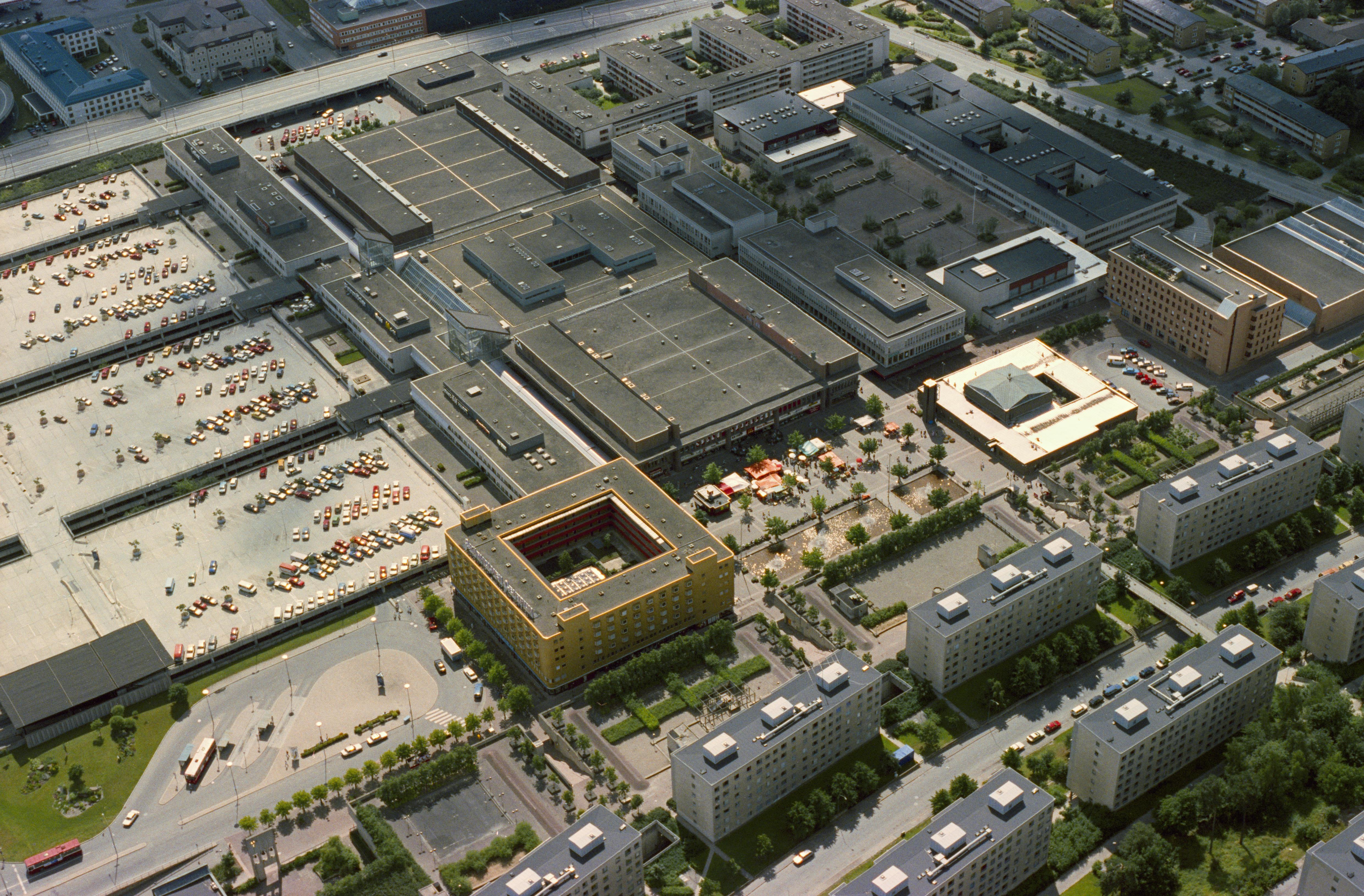 Beskrivning: Stadsdelen Skärholmen i Stockholms söderort. Skärholmens kyrka till höger om bildens mitt. Bilden är tagen mot (väderstreck): SV