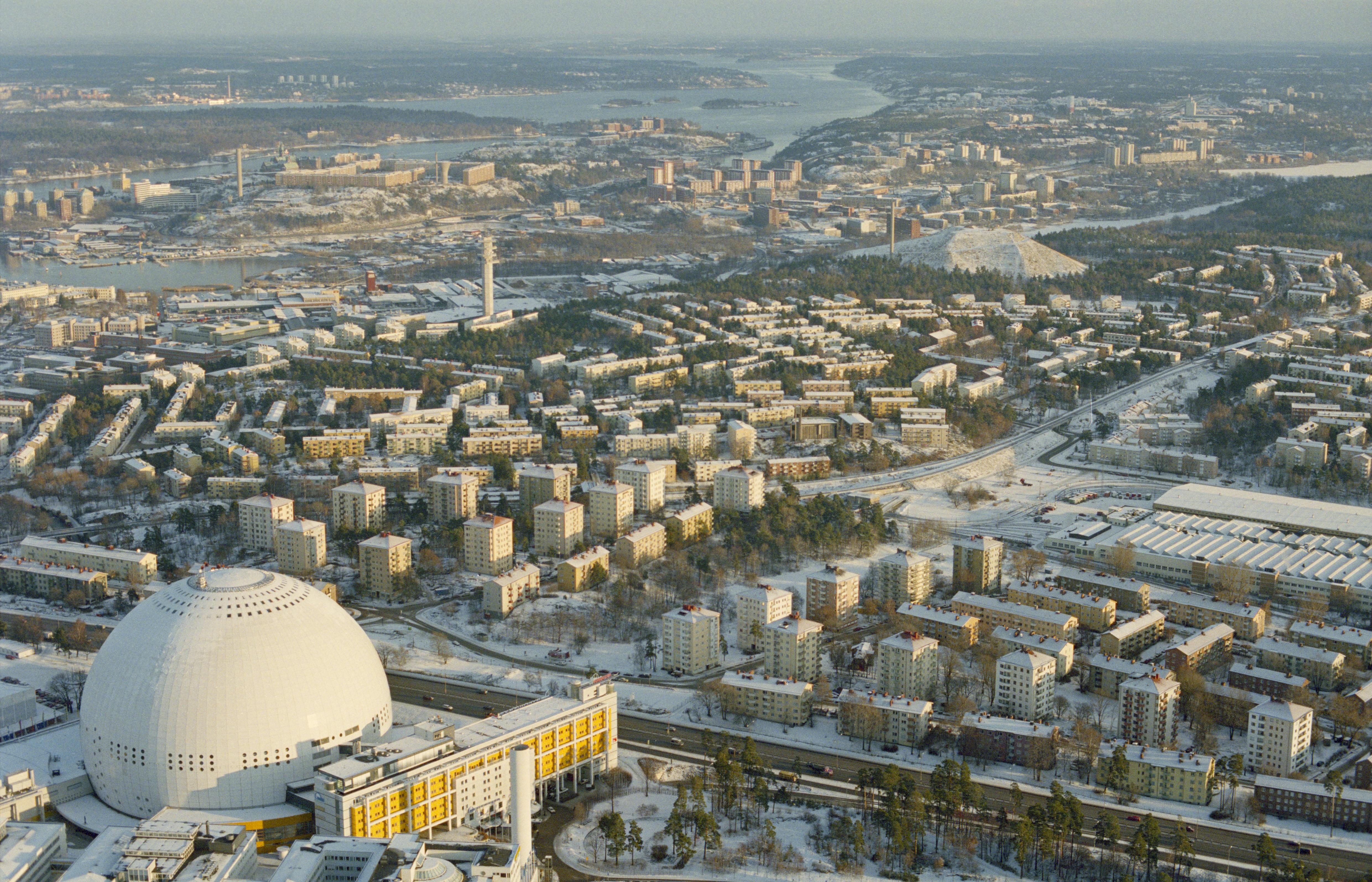 Beskrivning: Södra Stockholm. Ericsson Globe (Globen). Vy mot Hammarby, Henriksdal m.m. i Nacka socken. Bilden är tagen mot (väderstreck): Ö