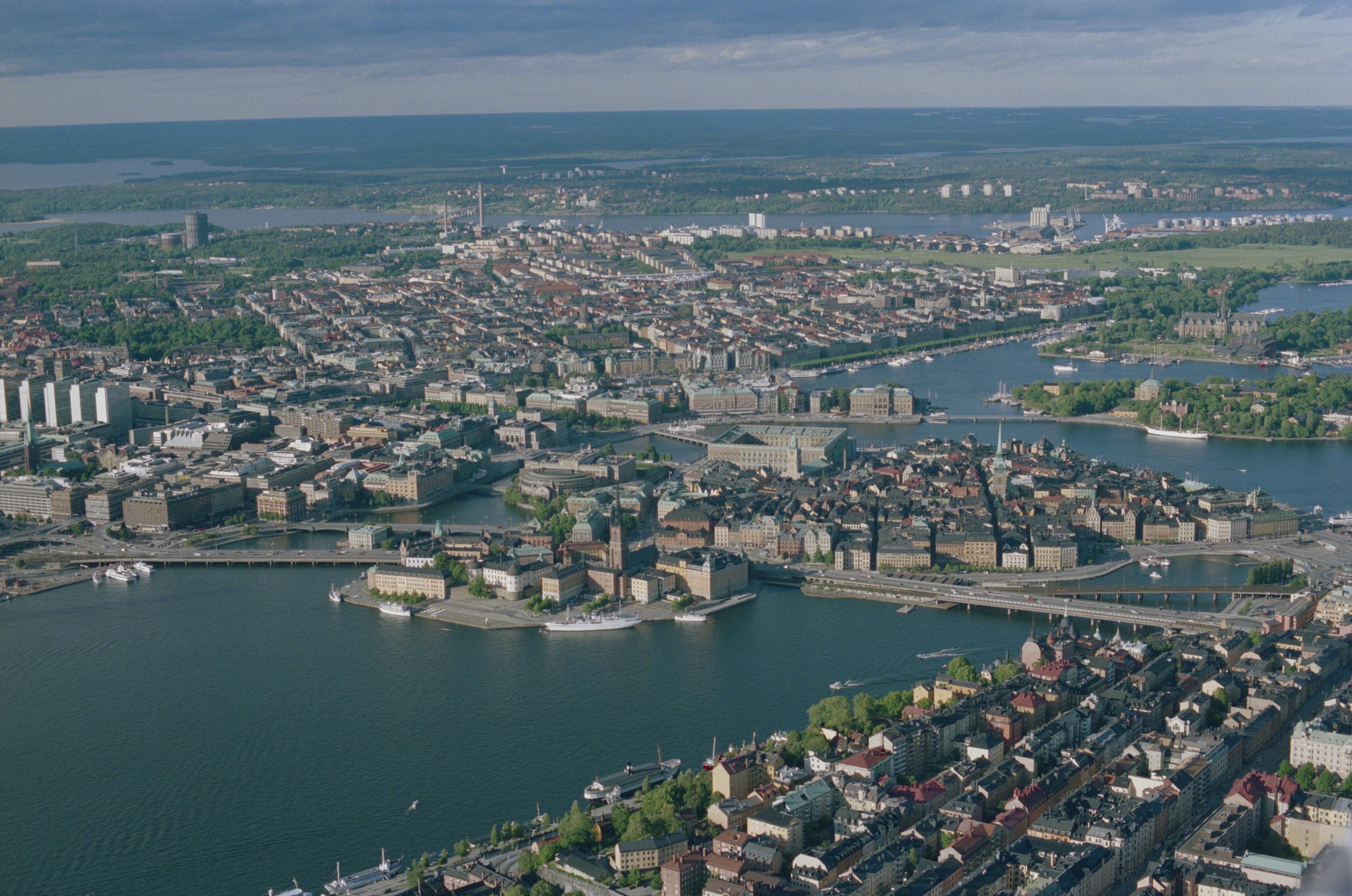 Beskrivning: Stockholms innerstad mellan Mälaren och Saltsjön (uppe till höger). Kungsholmen till vänster. Vid bildens mitt Riddarholmen med Riddarholmskyrkan och Gamla Stan med Kungliga slottet - statligt byggnadsminne RAÄnr Stockholm 43:1, Storkyrkan, Tyska kyrkan, m.fl. I bildens nedre del Södermalm med Slussen. I bildens övre del Vasastaden, Östermalm, Skeppsholmen, Norra Djurgården, Södra Djurgården med Nordiska Museet, m.fl. Bilden är tagen mot (väderstreck): NNO