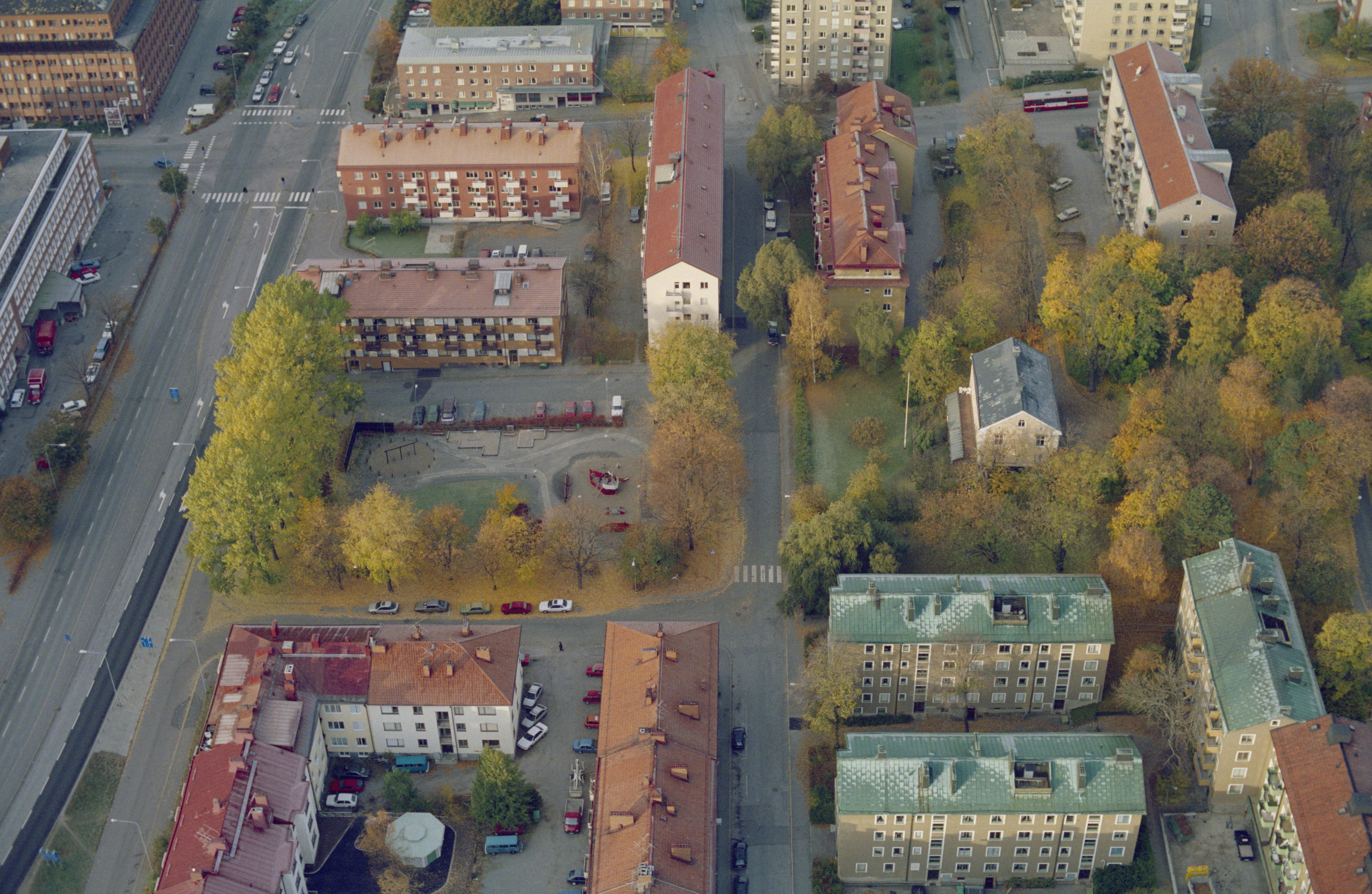 Beskrivning: Stamgårdsparken 3, Hamngatan, Tritonvägen och Trädgårdsgatan i området Lilla Alby i södra delen av Sundbyberg vid gränsen mot Solna socken (i bildens vänstra kant). Bilden är tagen mot (väderstreck): V