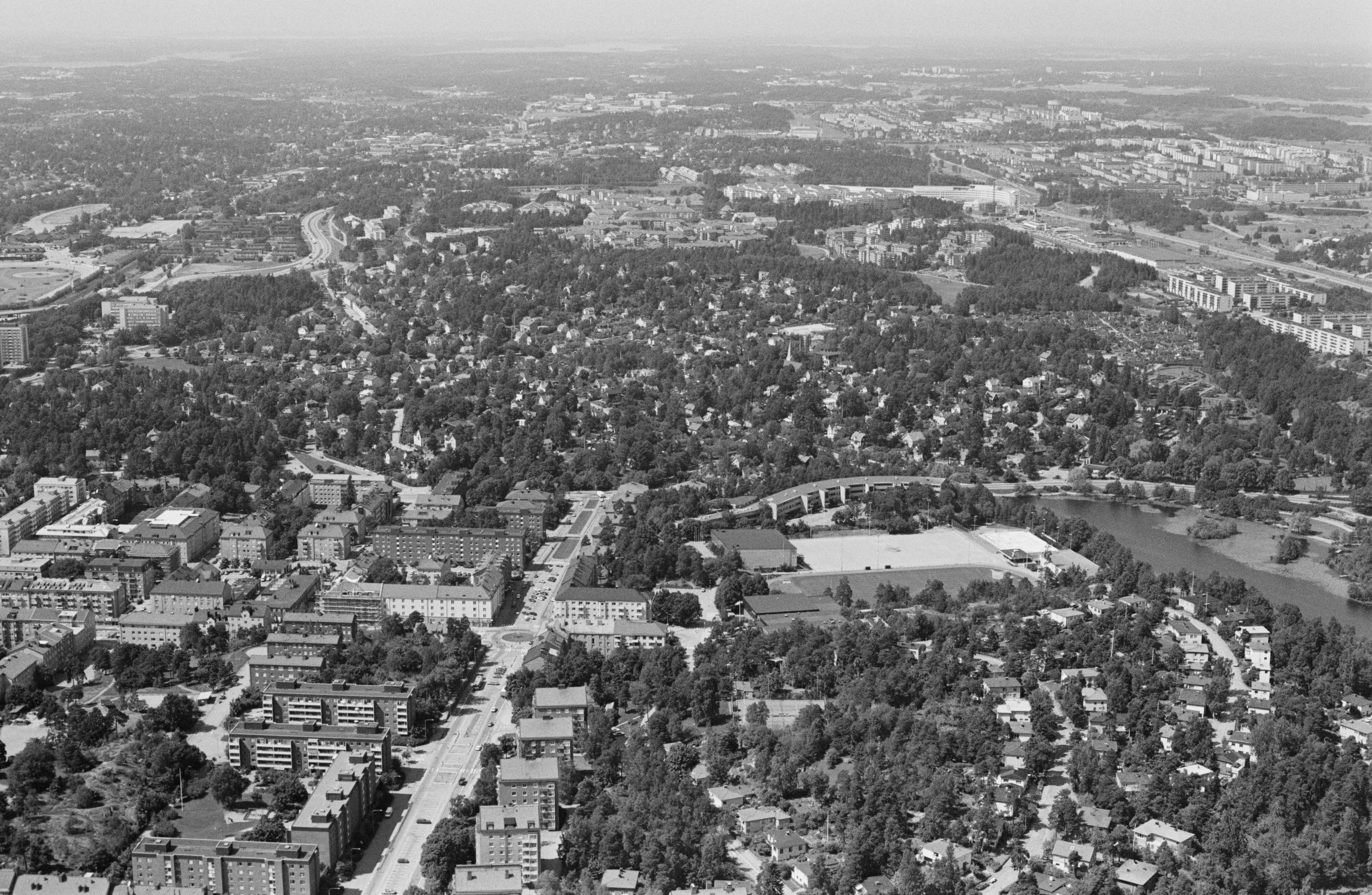 Beskrivning: Stadsdelen Duvbo i Sundbybergs kommun. Duvbo kyrka vid bildens mitt. Bilden är tagen mot (väderstreck): NNV