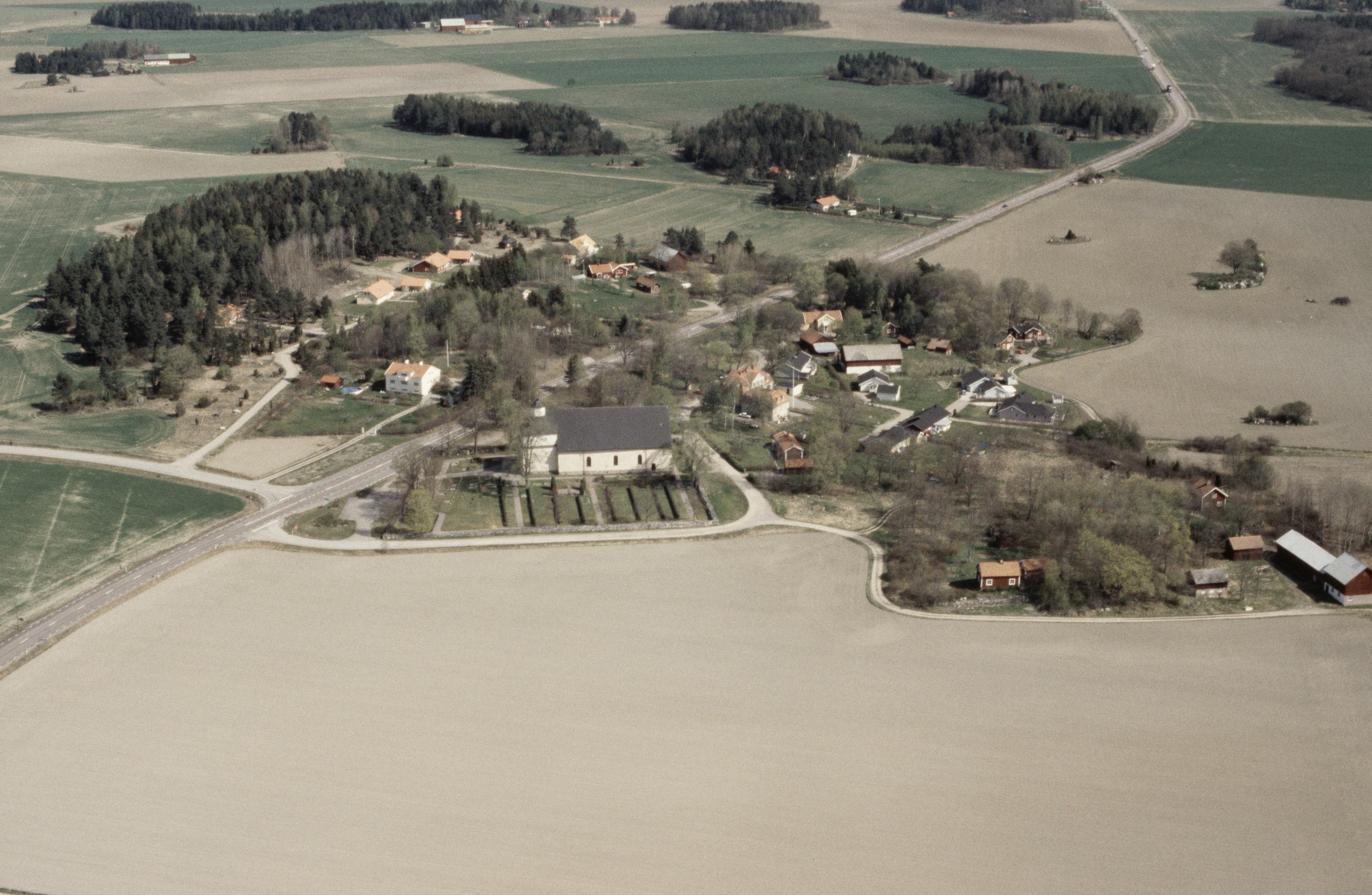 Beskrivning: Svinnegarns kyrka och kyrkby. Bilden är tagen mot (väderstreck): NNO