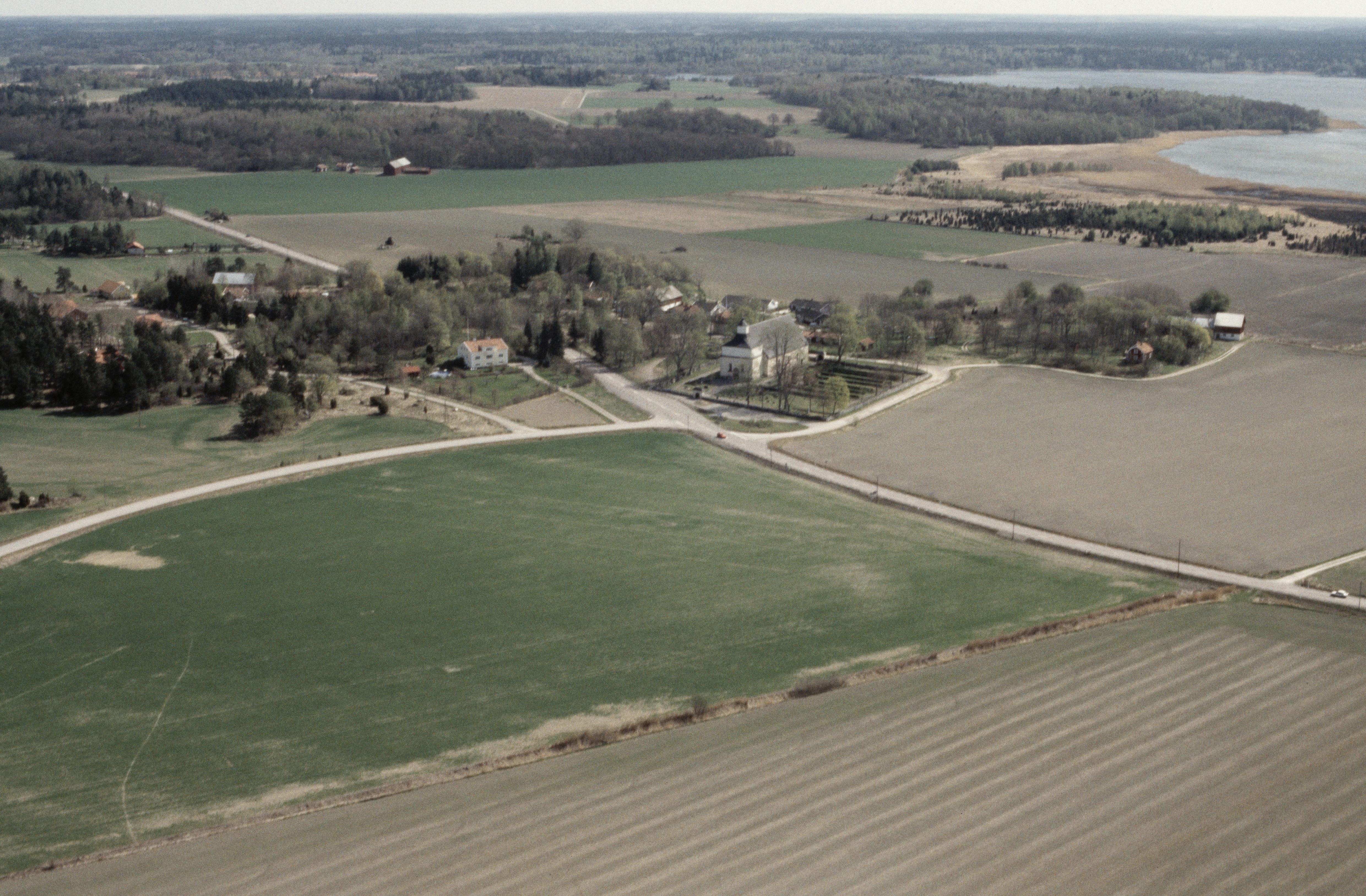 Beskrivning: Svinnegarns kyrka och kyrkby. Uppe till höger Svinnegarnsviken i Mälaren. Bilden är tagen mot (väderstreck): ONO