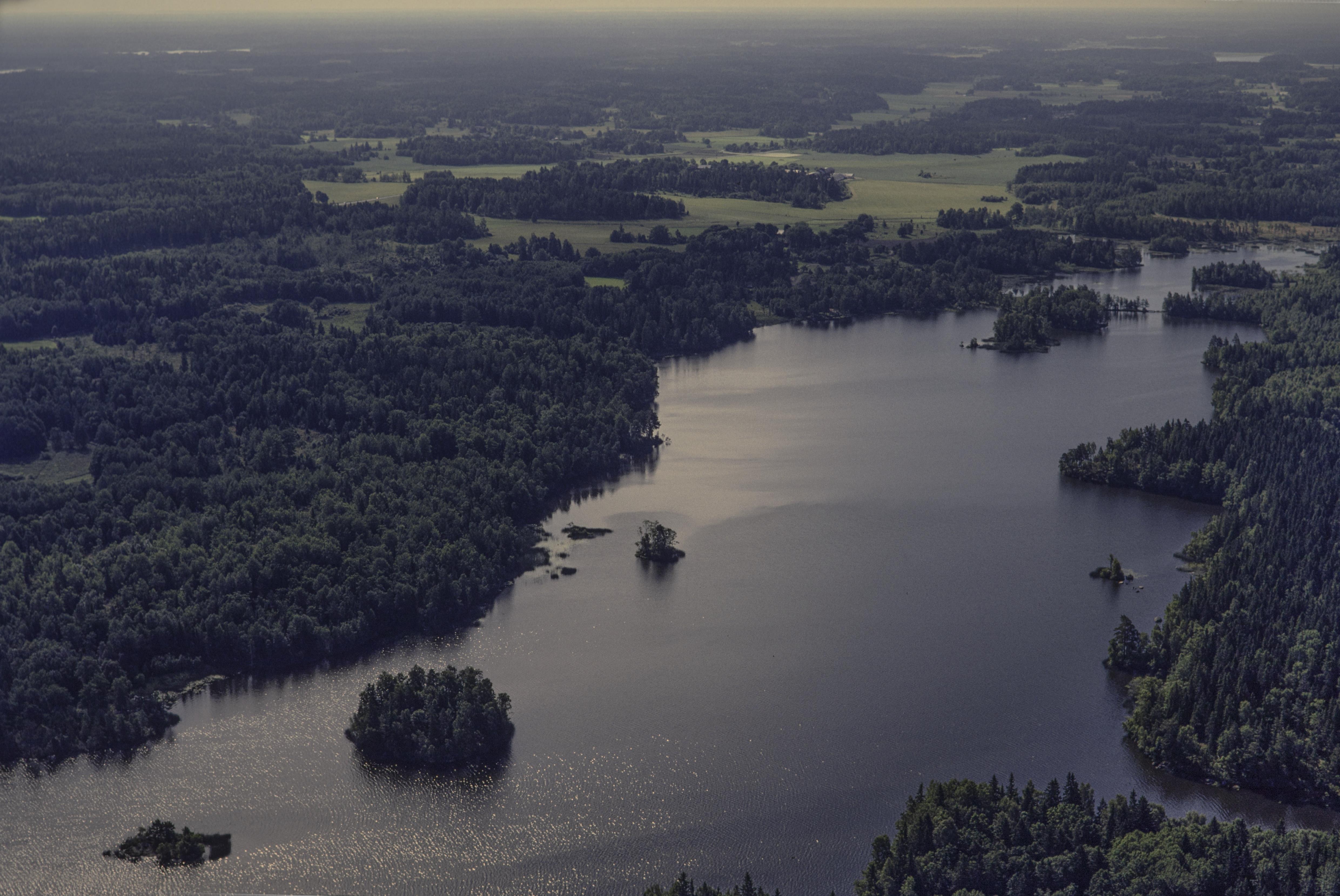 Beskrivning: Sjön Ströjan. Ströja by och Lillsjön i bildens övre del. Till vänster om bildens mitt fornborg RAÄnr Söderby-Karl 39:1. Bilden är tagen mot (väderstreck): SSO