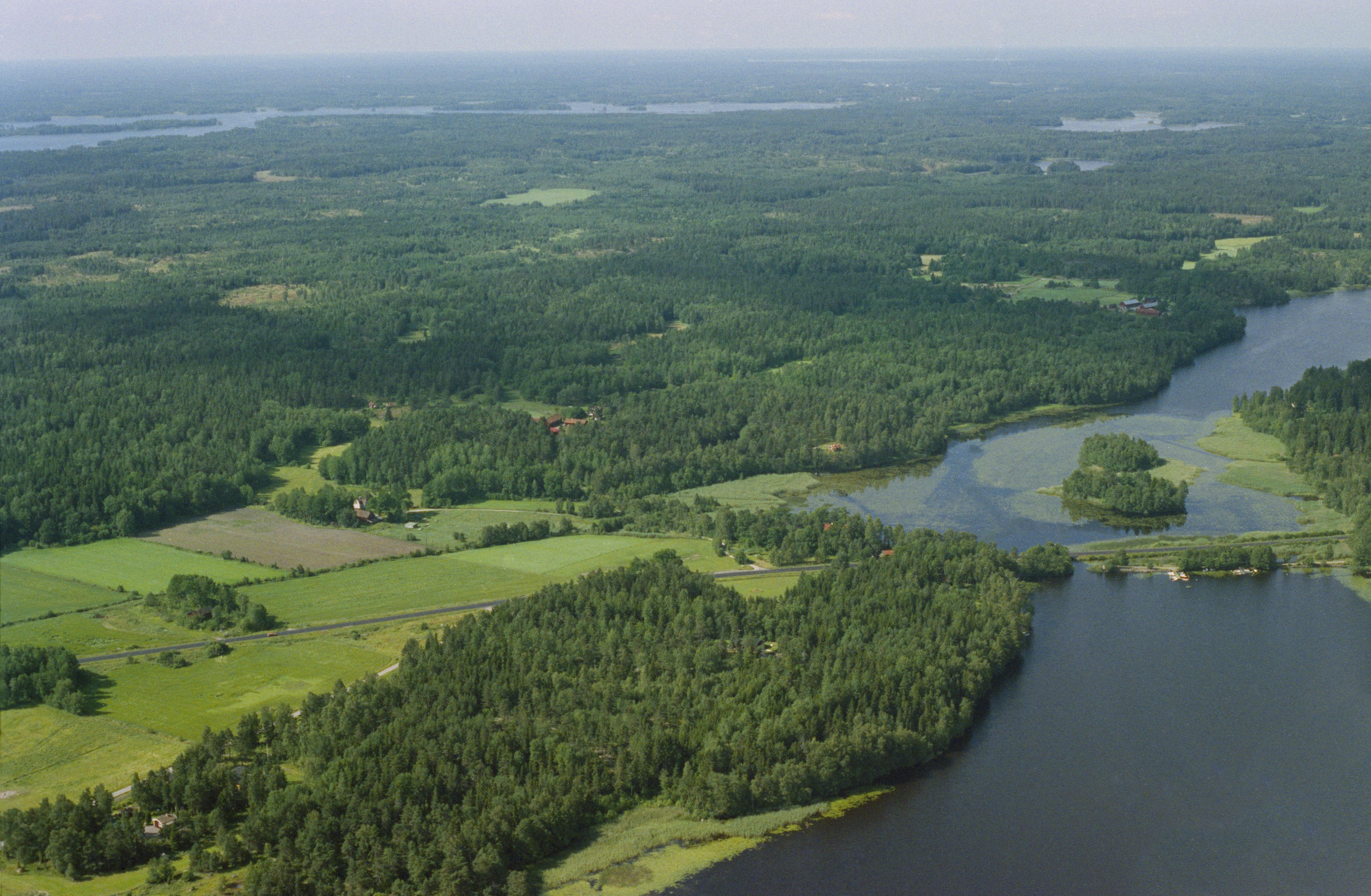 Beskrivning: Bronsåldersmiljö i Vagnåla från Unungehöjden. Sjön Närdingen mellan socknen Söderby-Karl (uppe till vänster) och Edsbro (uppe till höger). Tomasbol, Österbol och gravfält RAÄnr Ununge 189:1 m.fl. vid bildens mitt. Bilden är tagen mot (väderstreck): SV
