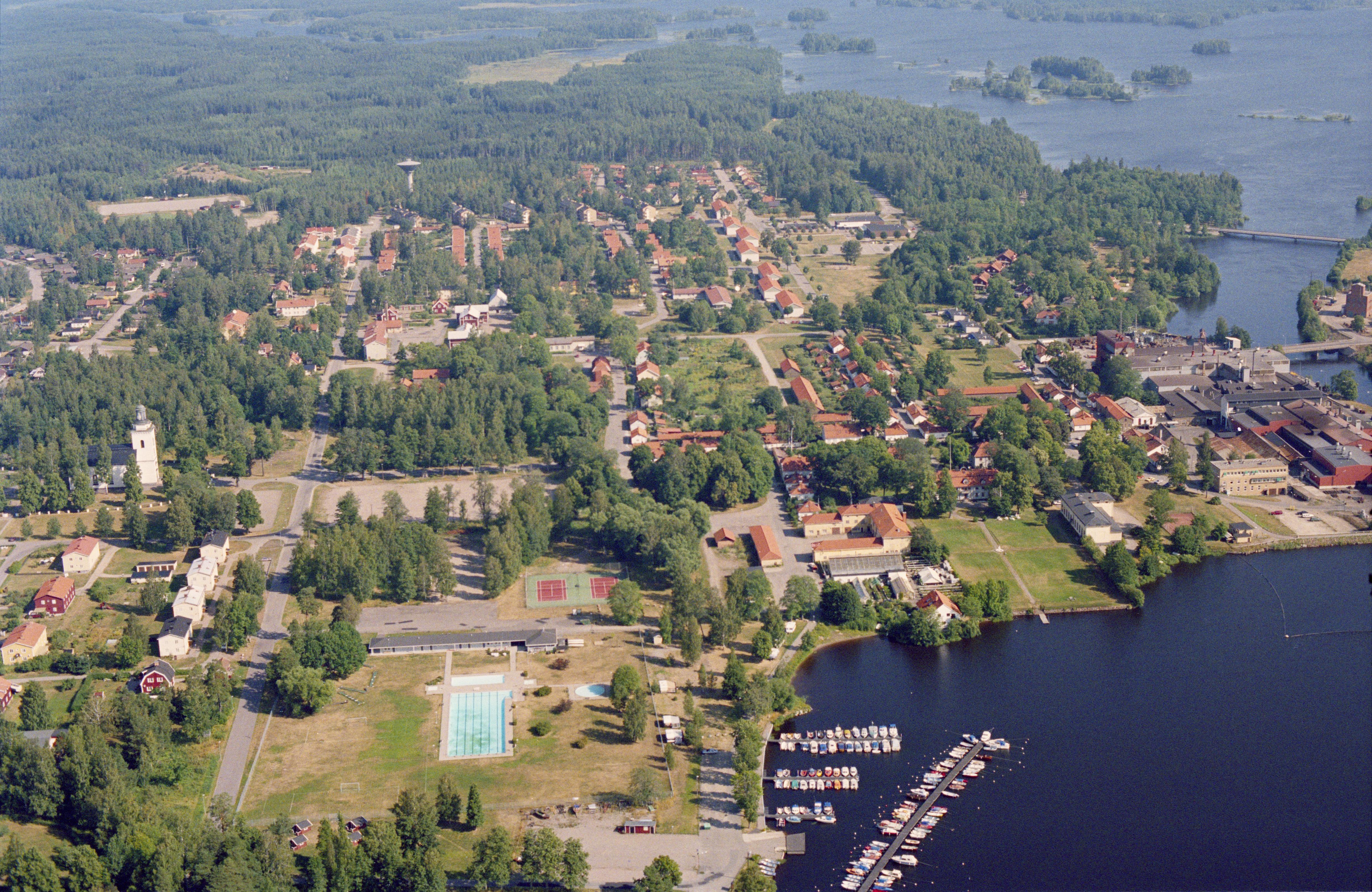 Beskrivning: Söderfors tätort / Söderfors bruk. Byggnadsminne med bl.a. hytt- och hammarområde RAÄnr Söderfors 90. Söderfors kyrka till vänster om bildens mitt. Sjön Fäbodfjärden i bildens nedre del, i bildens övre del sjön Untrafjärden. Bilden är tagen mot (väderstreck): NO