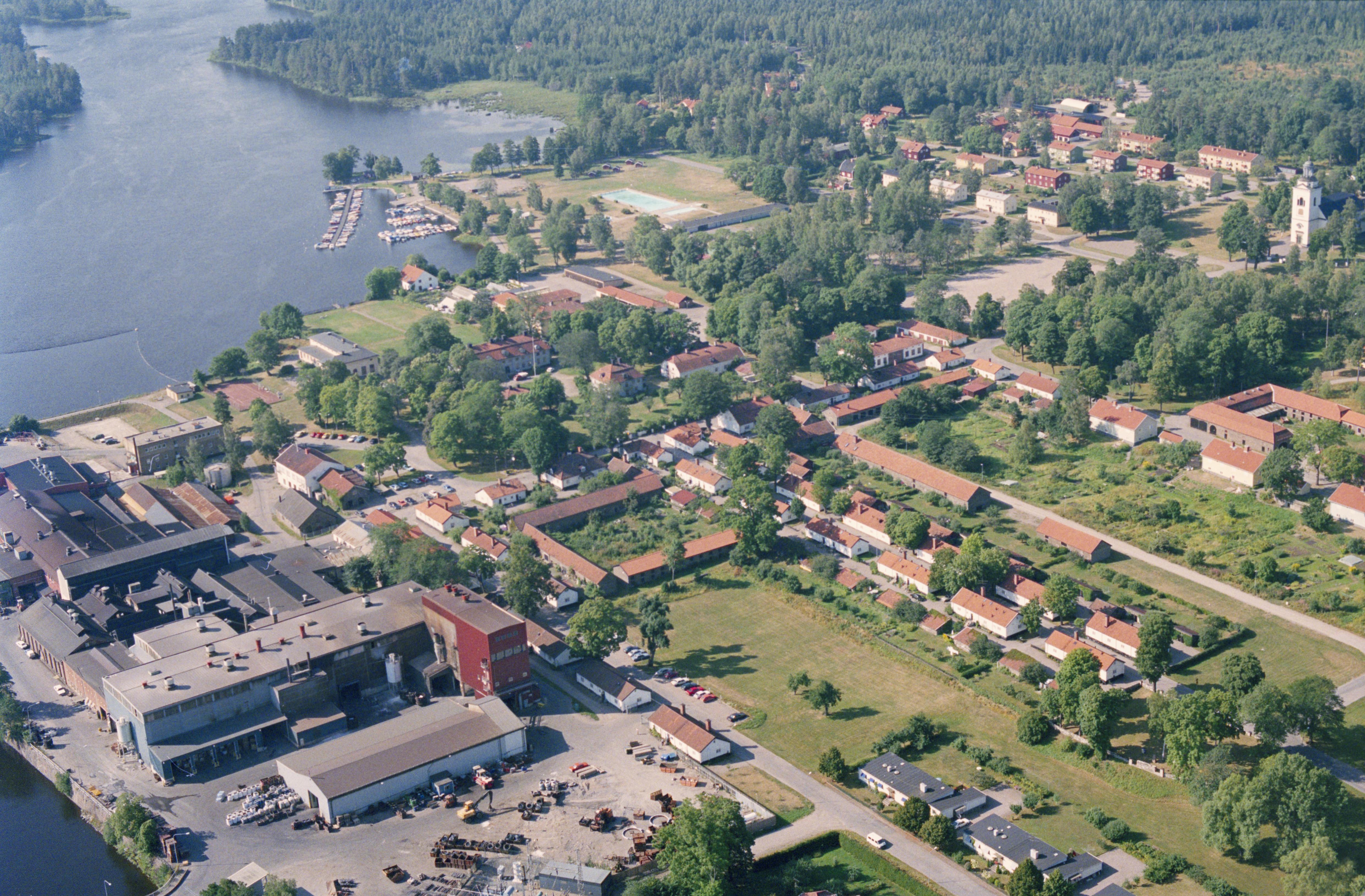 Beskrivning: Söderfors tätort / Söderfors bruk. Byggnadsminne med bl.a. hytt- och hammarområde RAÄnr Söderfors 90. Söderfors kyrka uppe till höger. Sjön Fäbodfjärden i bildens övre del. Bilden är tagen mot (väderstreck): VSV
