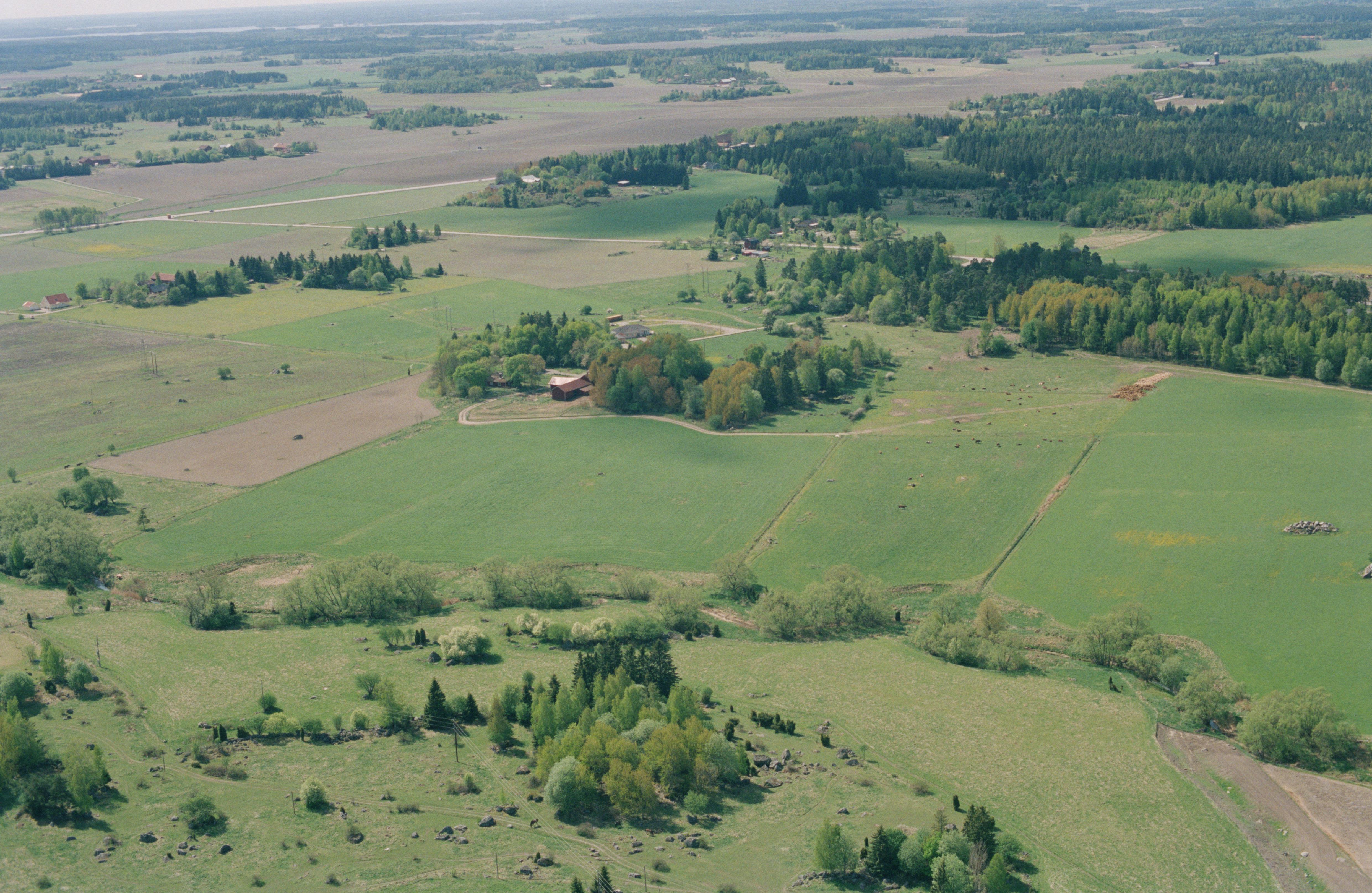 Beskrivning: Område norr om Gumsbo. Vid bildens mitt Karlslund och Kvarnbacken med stensättningar Tillinge 130:1-2 m.fl. Örbäcken i bildens nedre del. Bilden är tagen mot (väderstreck): V