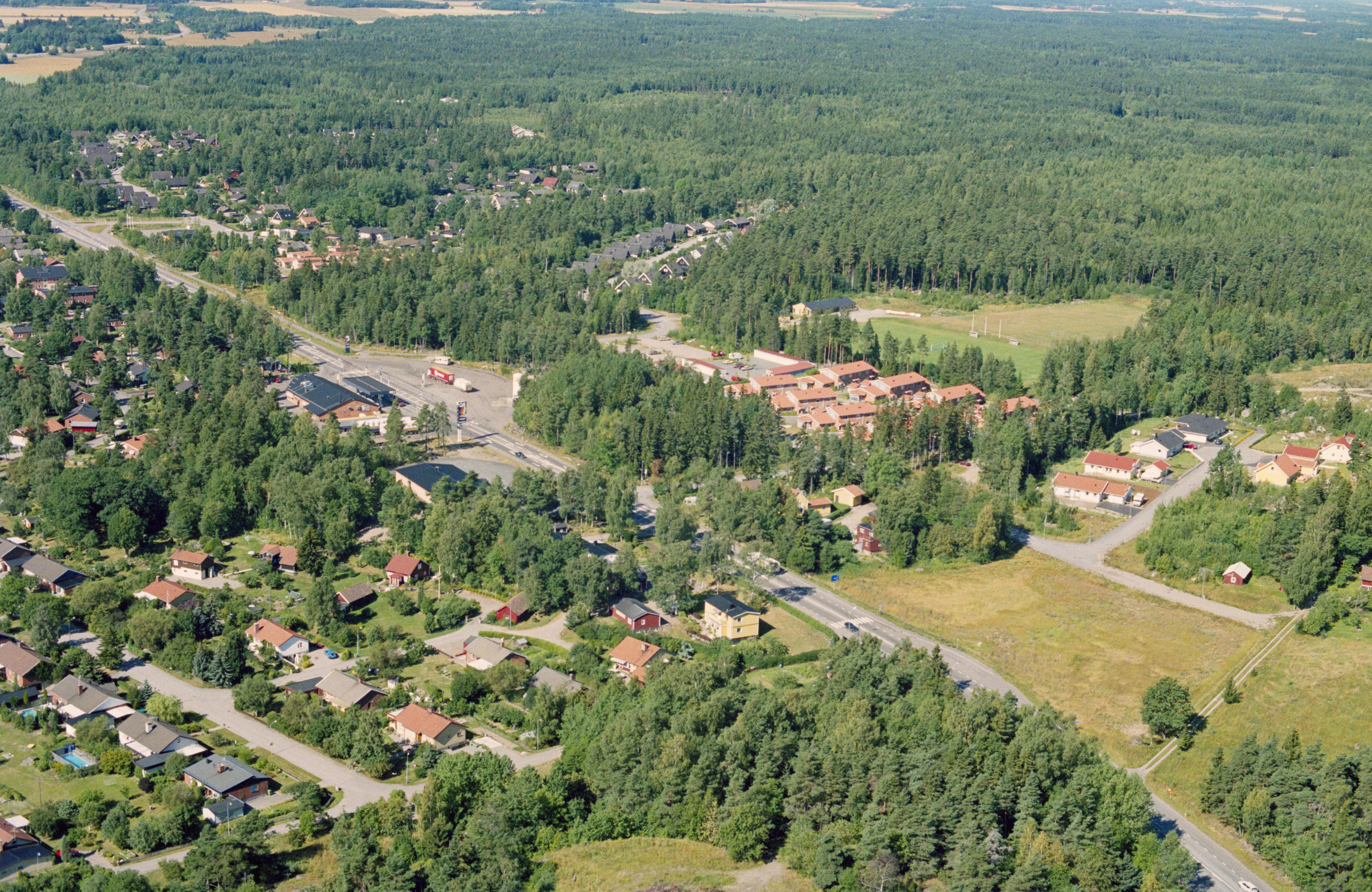 Beskrivning: Hummelsta tätort. Till vänster om bildens mitt Hummelstabaren - en bensinstation och restaurang som startades 1959. Bilden är tagen mot (väderstreck): V