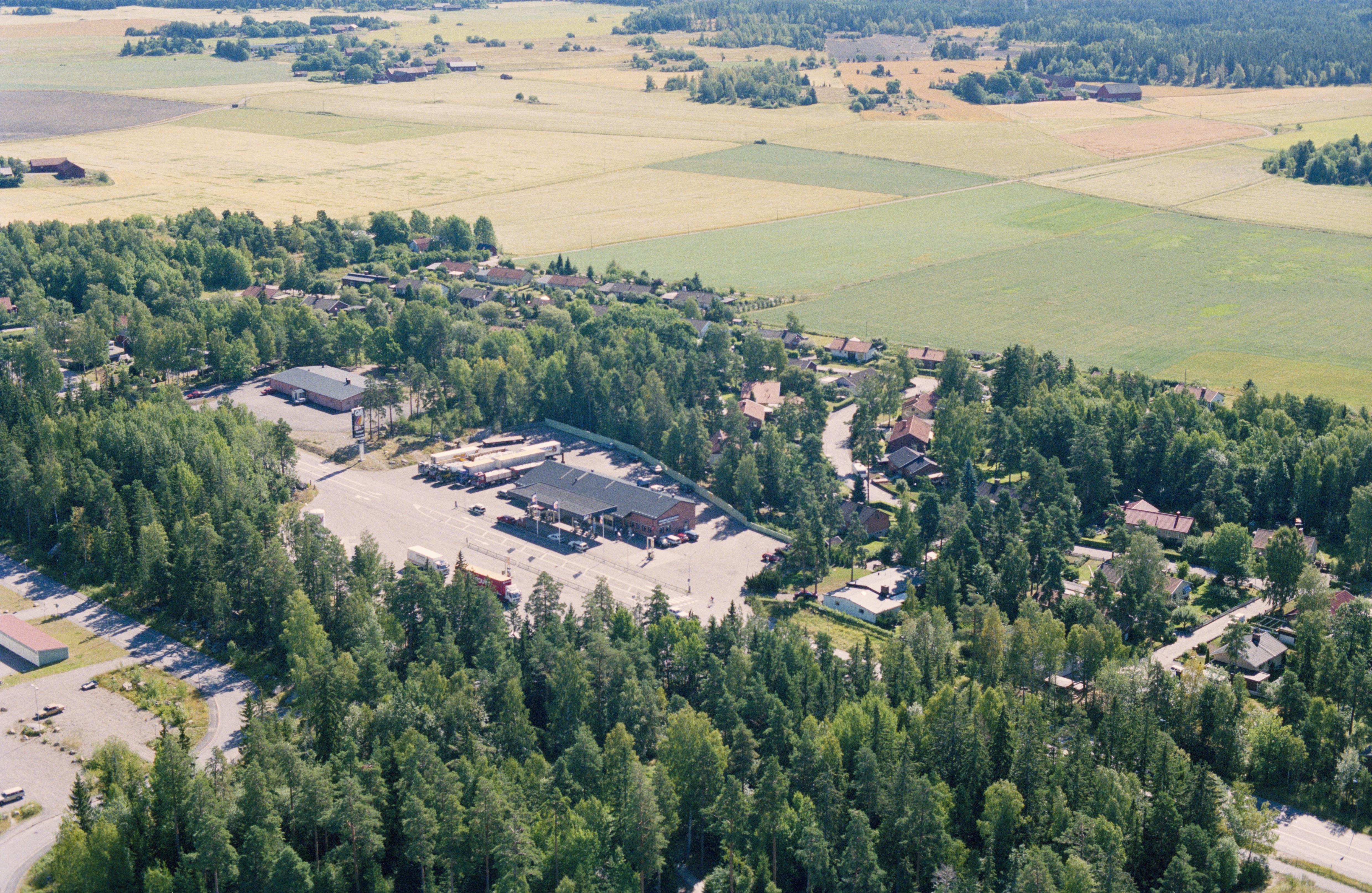 Beskrivning: Hummelsta tätort. Vid bildens mitt Hummelstabaren - en bensinstation och restaurang som startades 1959. Bilden är tagen mot (väderstreck): SO