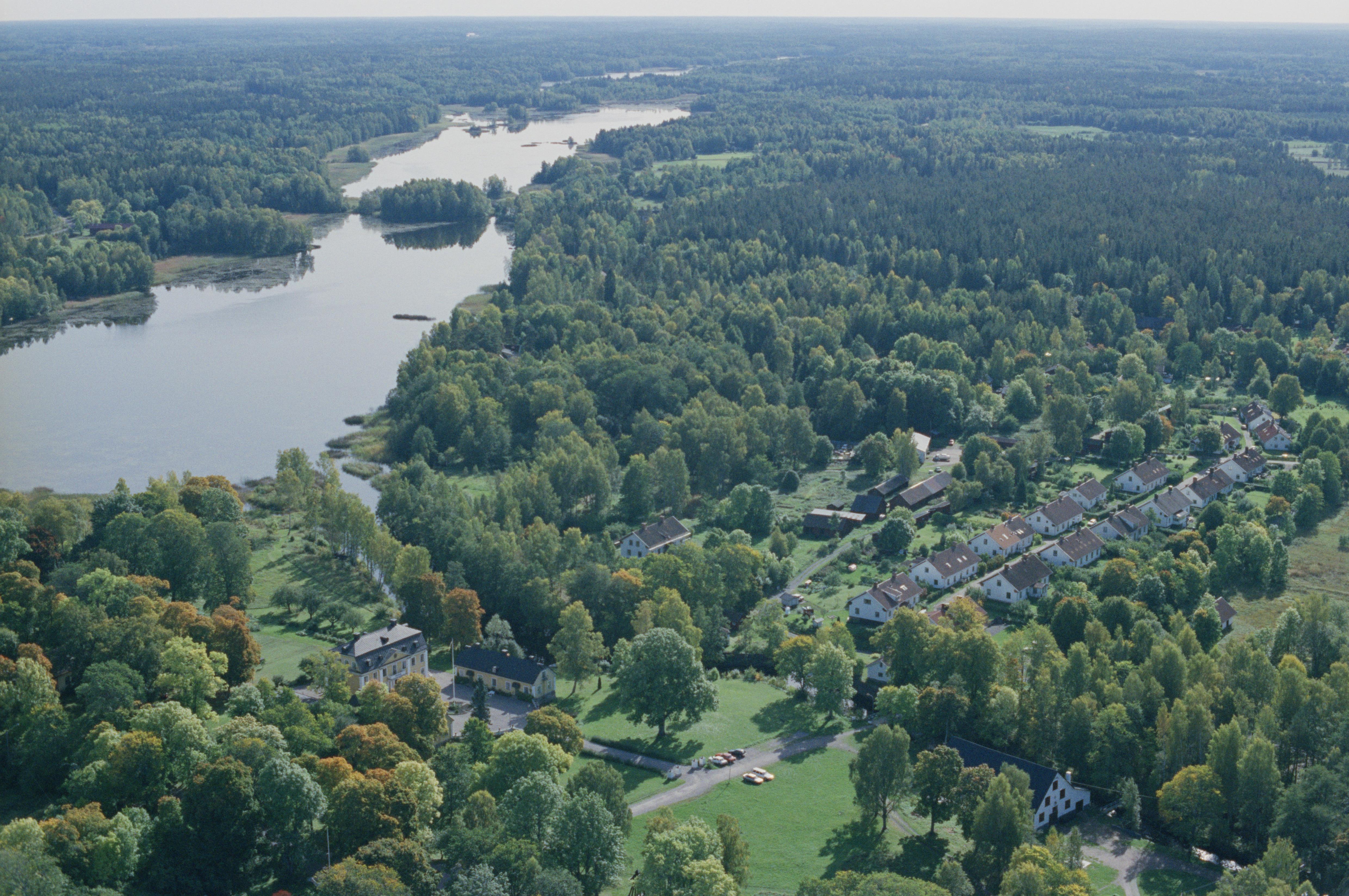 Beskrivning: Skebobruk RAÄnr Ununge 127:1 vid Skeboån och sjön Närdingen. Till vänster under bildens mitt Skebobruks herrgård. Bilden är tagen mot (väderstreck): SO
