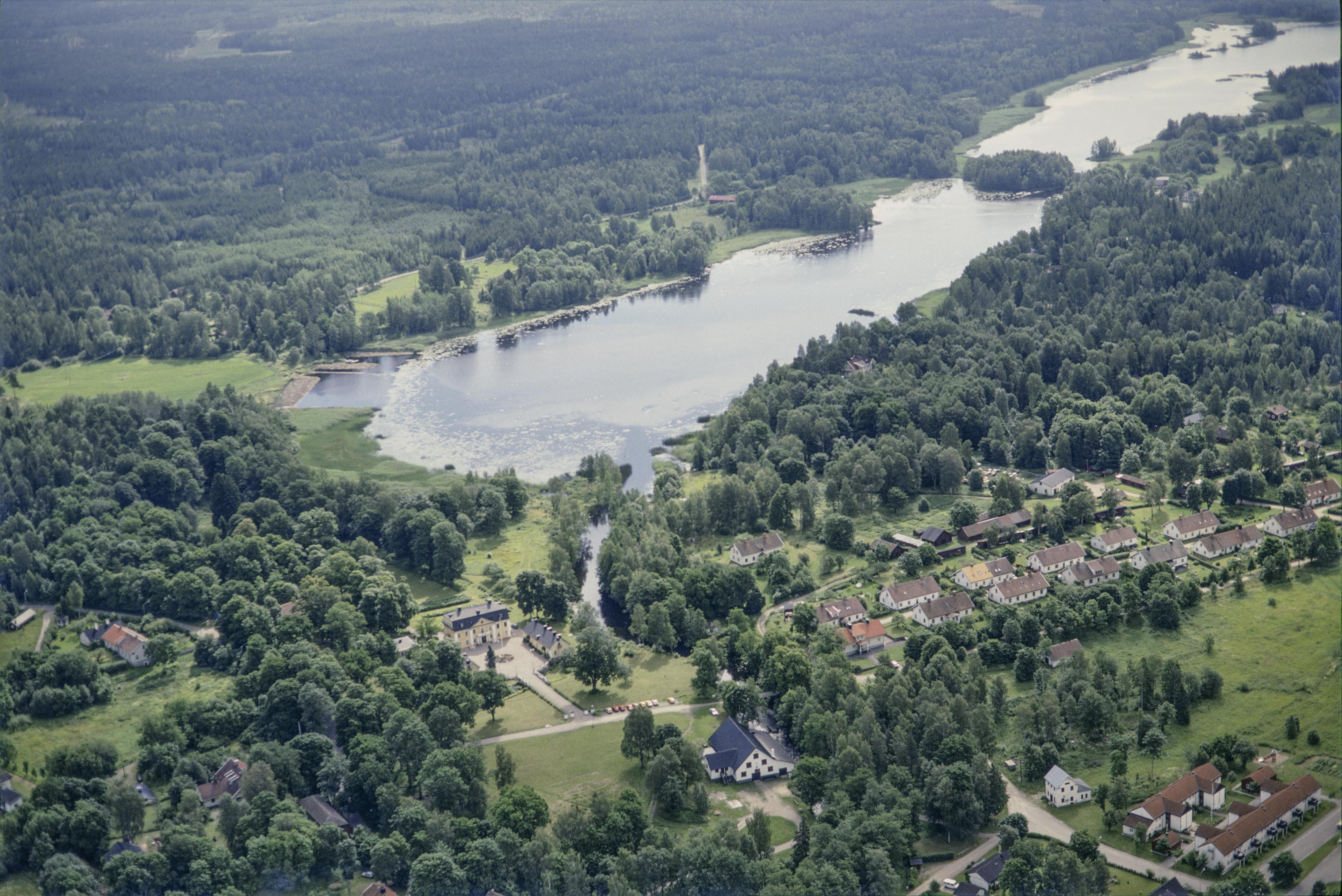 Beskrivning: Skebobruk RAÄnr Ununge 127:1 vid Skeboån och sjön Närdingen. Nere till vänster Skebobruks herrgård. Bilden är tagen mot (väderstreck): SO