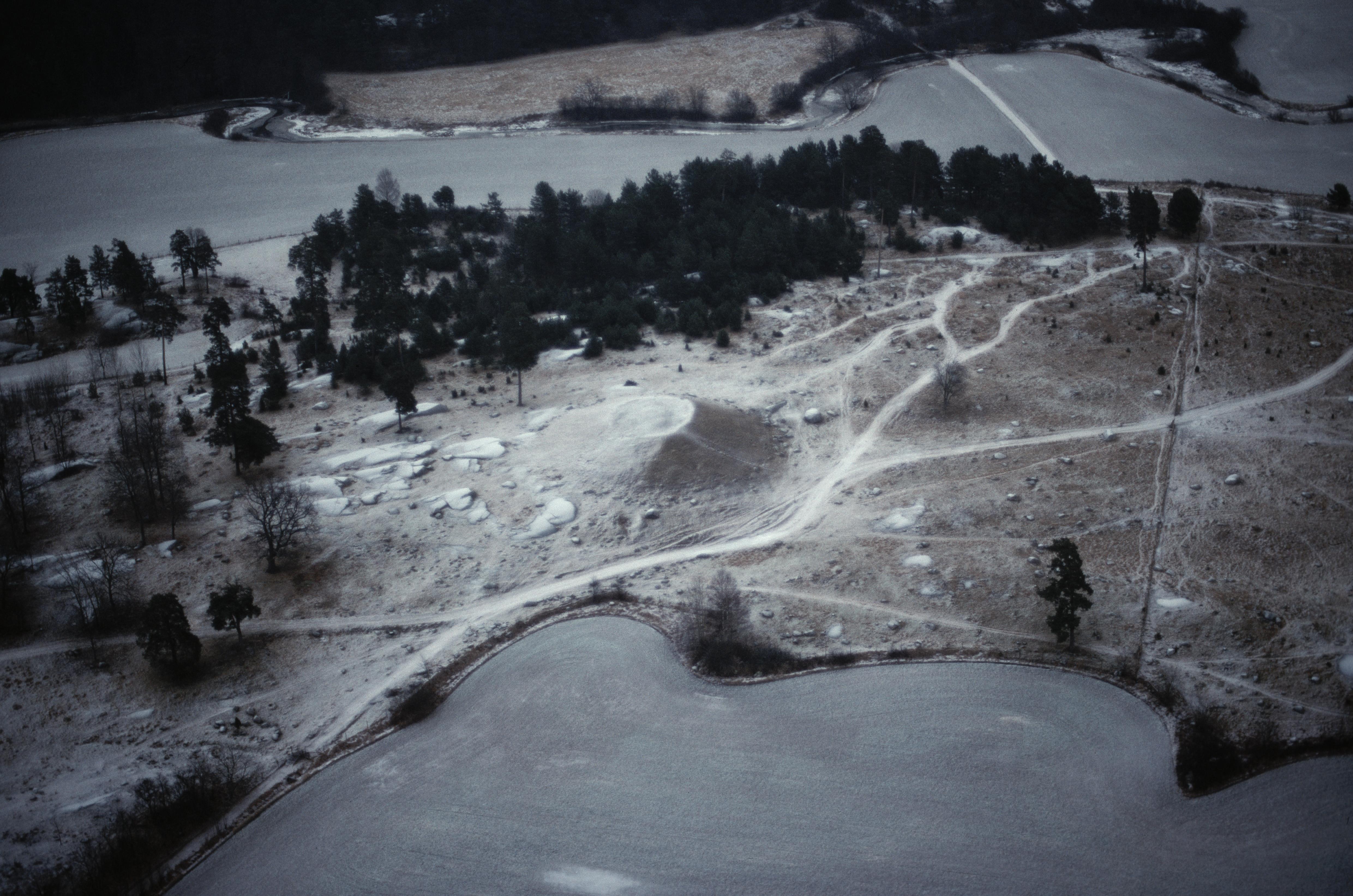 Beskrivning: Hagaåns dalgång vid Håga by. Vid bildens mitt Hågahögen / Kung Björns hög RAÄnr Uppsala 356:1. Bilden är tagen mot (väderstreck): Ö