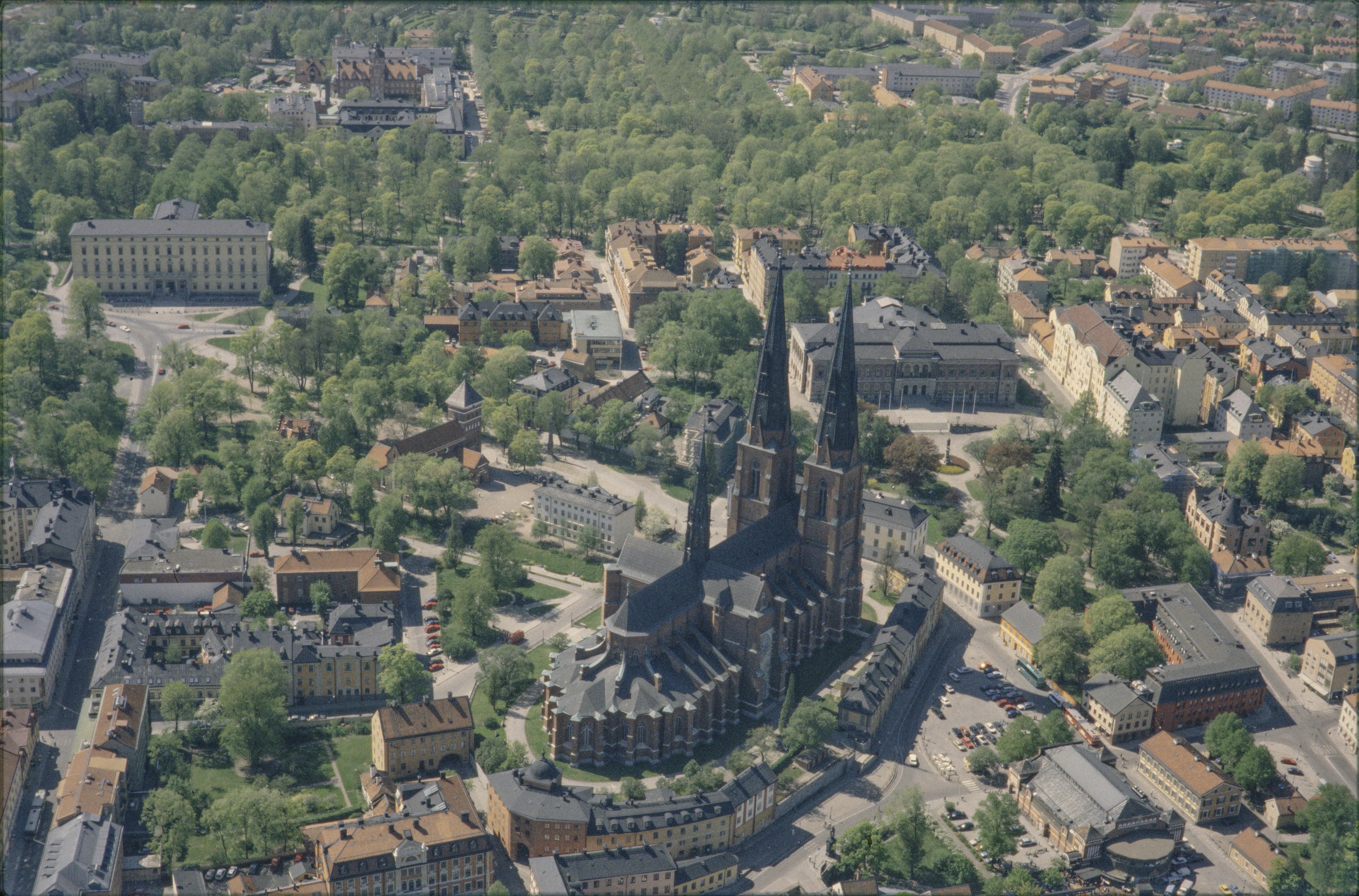 Beskrivning: Uppsala domkyrka, Riddartorget och stadslager RAÄnr Uppsala 88:1 i Uppsala stad. Vid kyrkan ett statligt byggnadsminne Gamla domkapitelhuset RAÄnr Uppsala 46:1. Bilden är tagen mot (väderstreck): SV