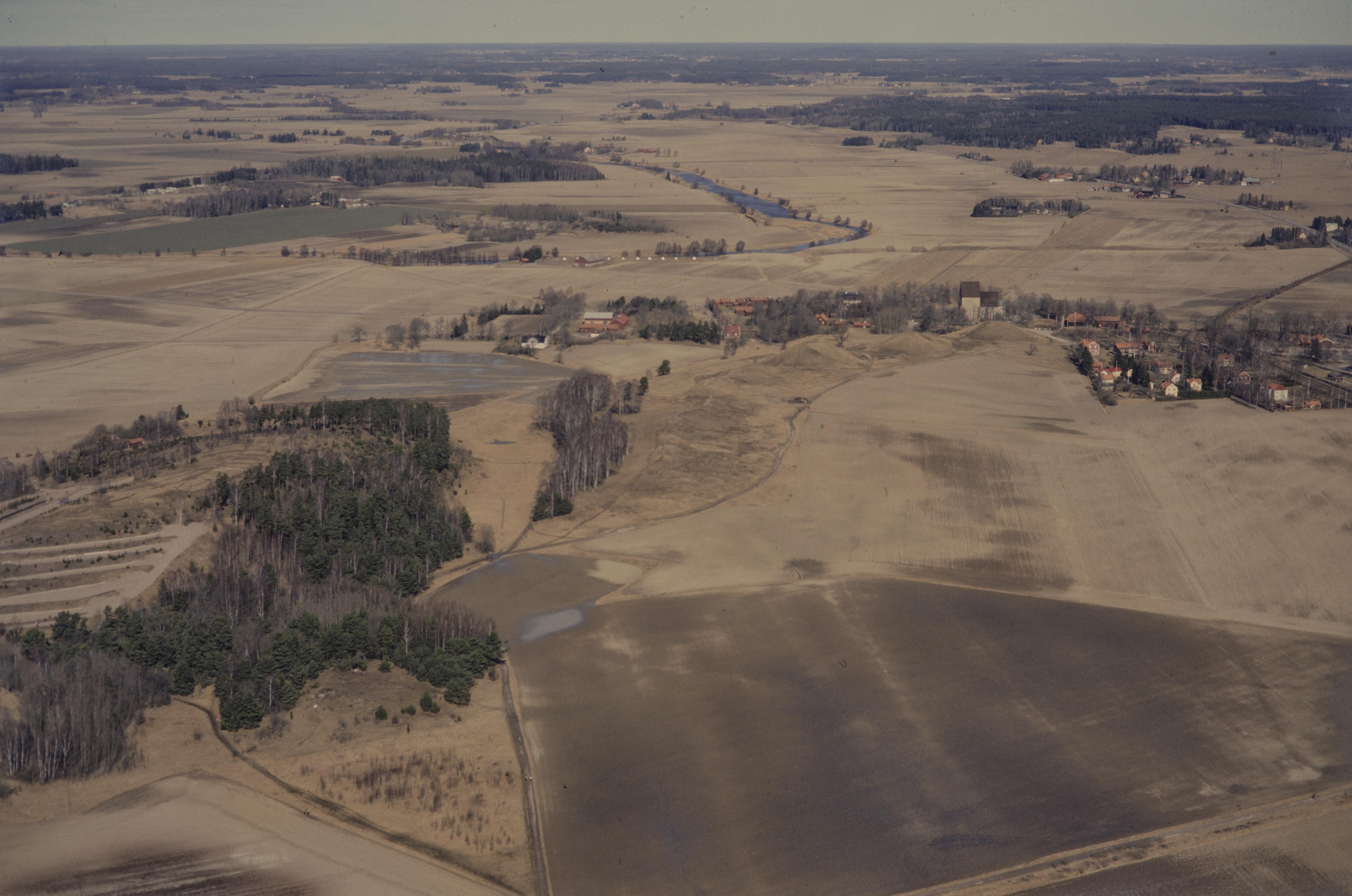 Beskrivning: Fyrisåns dalgång. Över bildens mitt Gamla Uppsala kyrka RAÄnr Uppsala 774, Kungshögarna gravfält Uppsala 123:1, boplats Uppsala 263:1 m.fl. Bilden är tagen mot (väderstreck): N