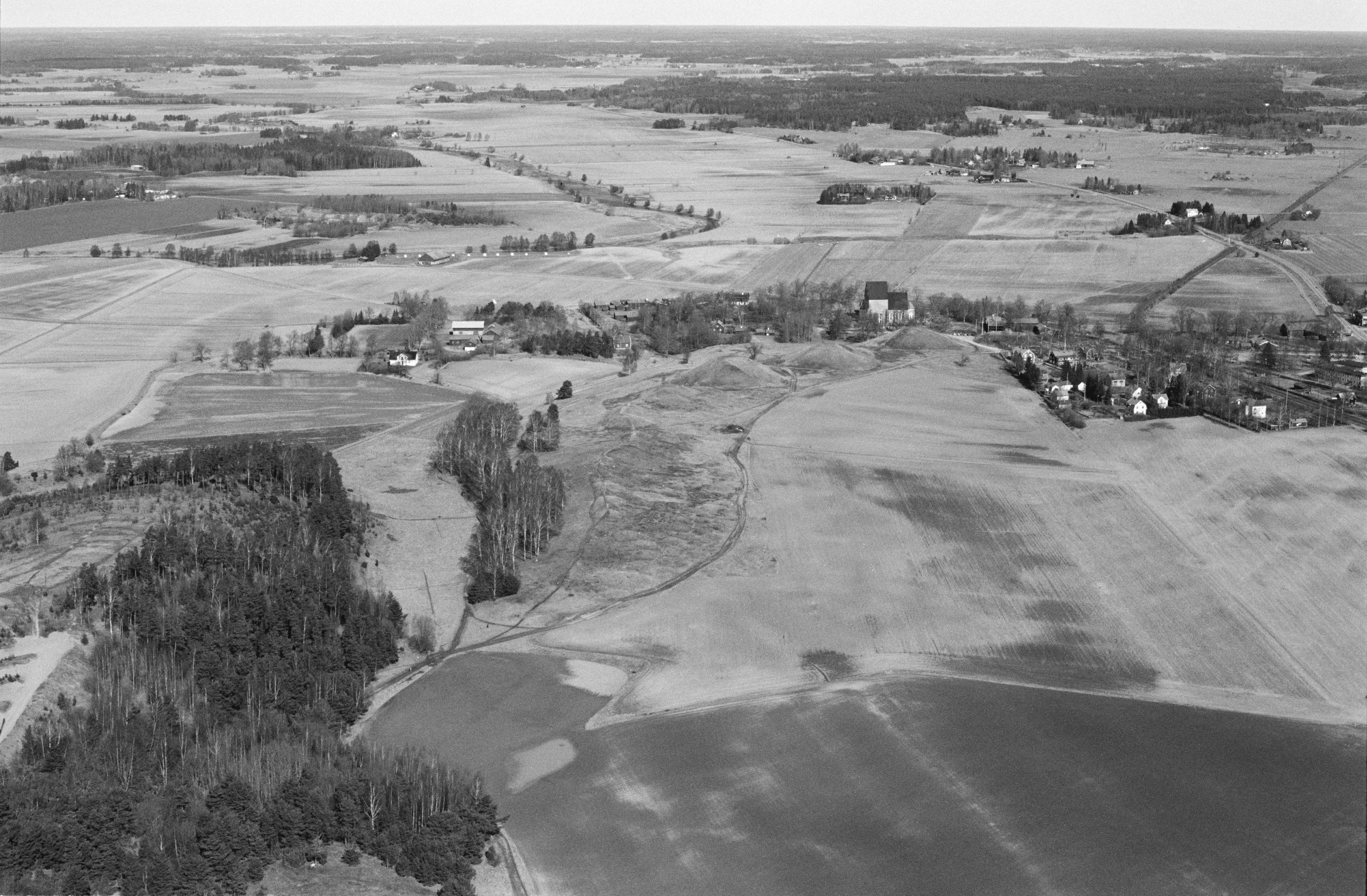 Beskrivning: Fyrisåns dalgång. Över bildens mitt Gamla Uppsala kyrka RAÄnr Uppsala 774, Kungshögarna gravfält Uppsala 123:1, boplats Uppsala 263:1 m.fl. Bilden är tagen mot (väderstreck): N