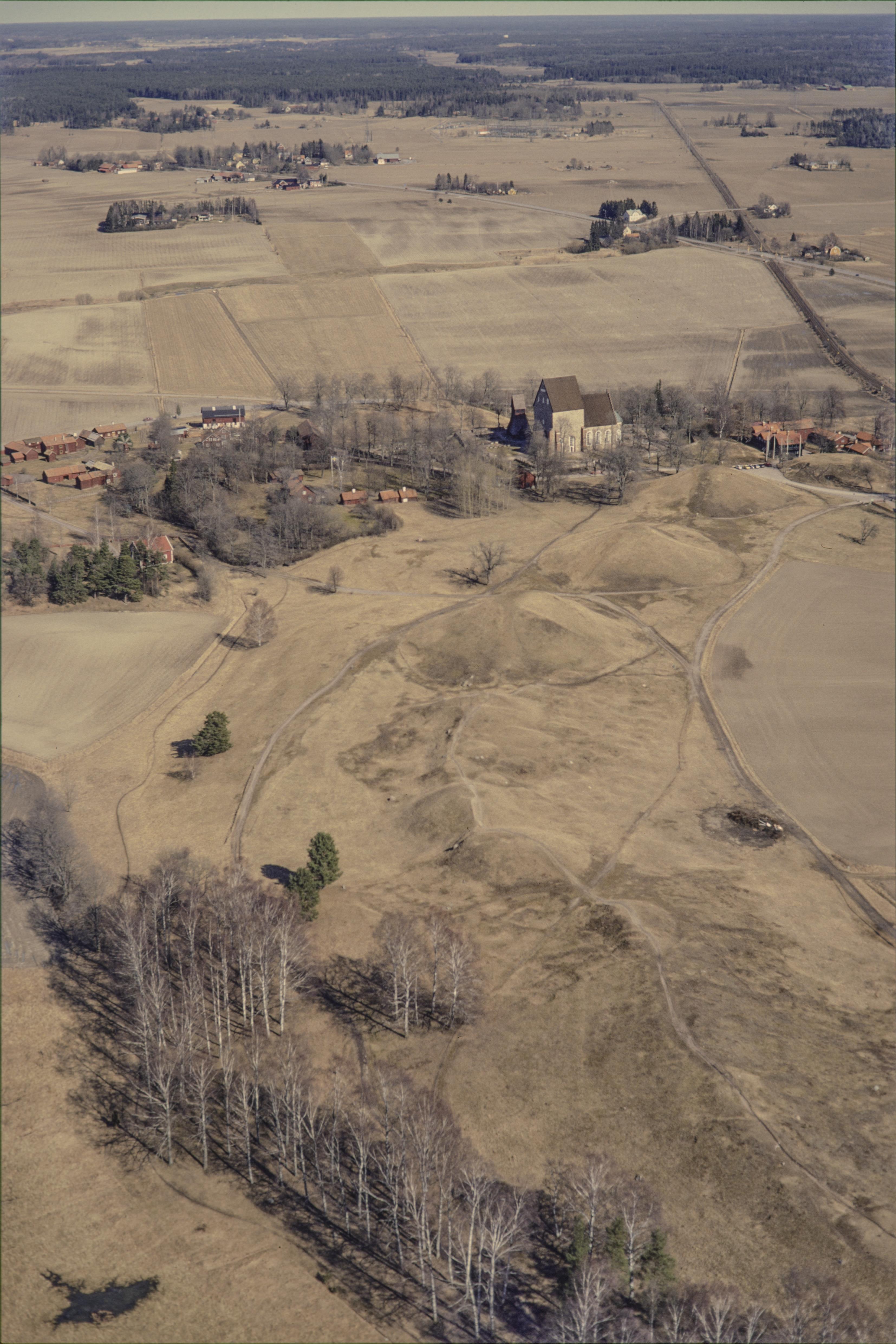 Beskrivning: Fyrisåns dalgång. Gamla Uppsala kyrka RAÄnr Uppsala 774, Kungshögarna gravfält Uppsala 123:1, boplats Uppsala 263:1 m.fl. Bilden är tagen mot (väderstreck): NO